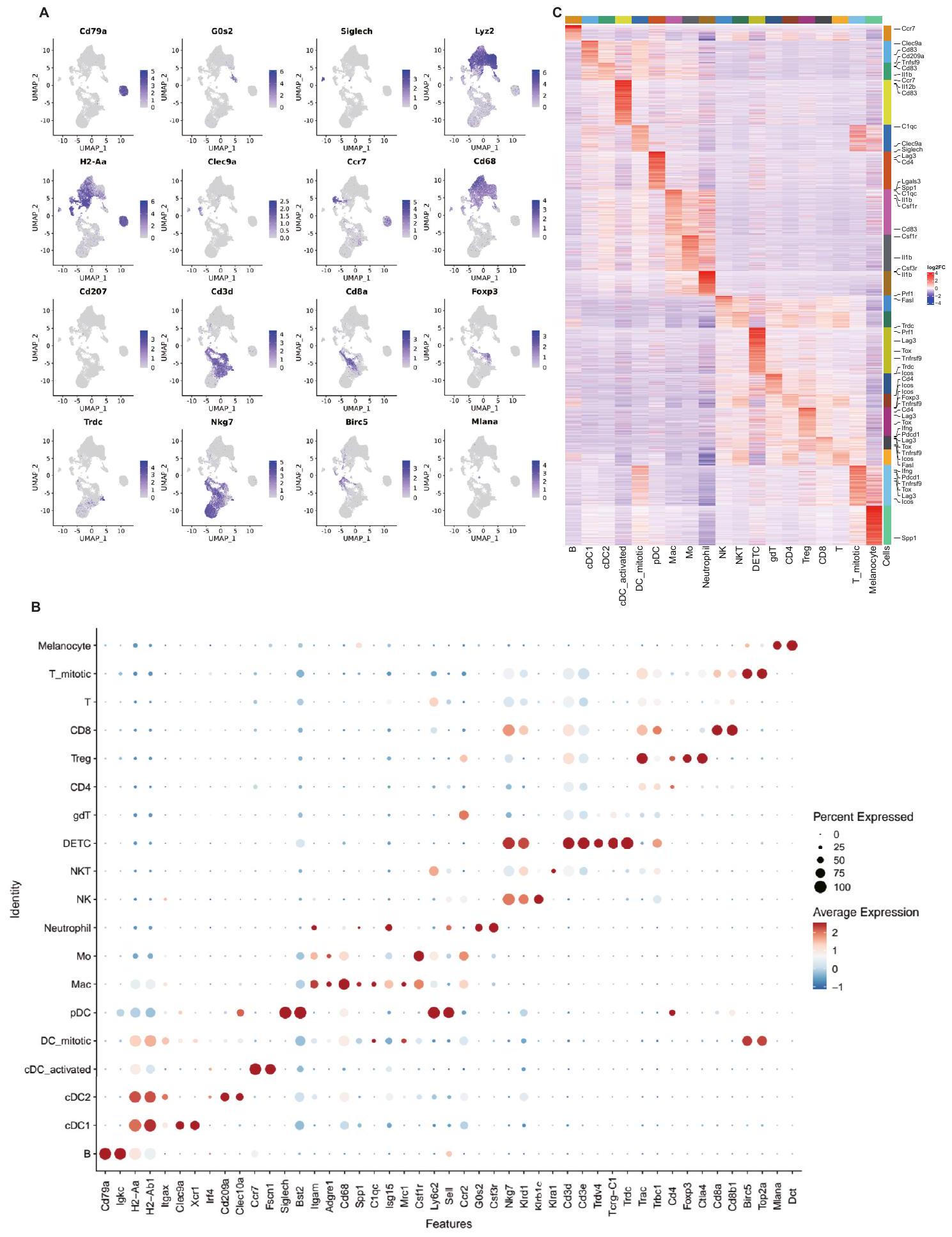 (A-C) Feature plot and heatmap of genes to identify each leukocyte cluster obtained by scRNA-seq of B16-F10-OVA tumors, harvested at 4 different times of the day.