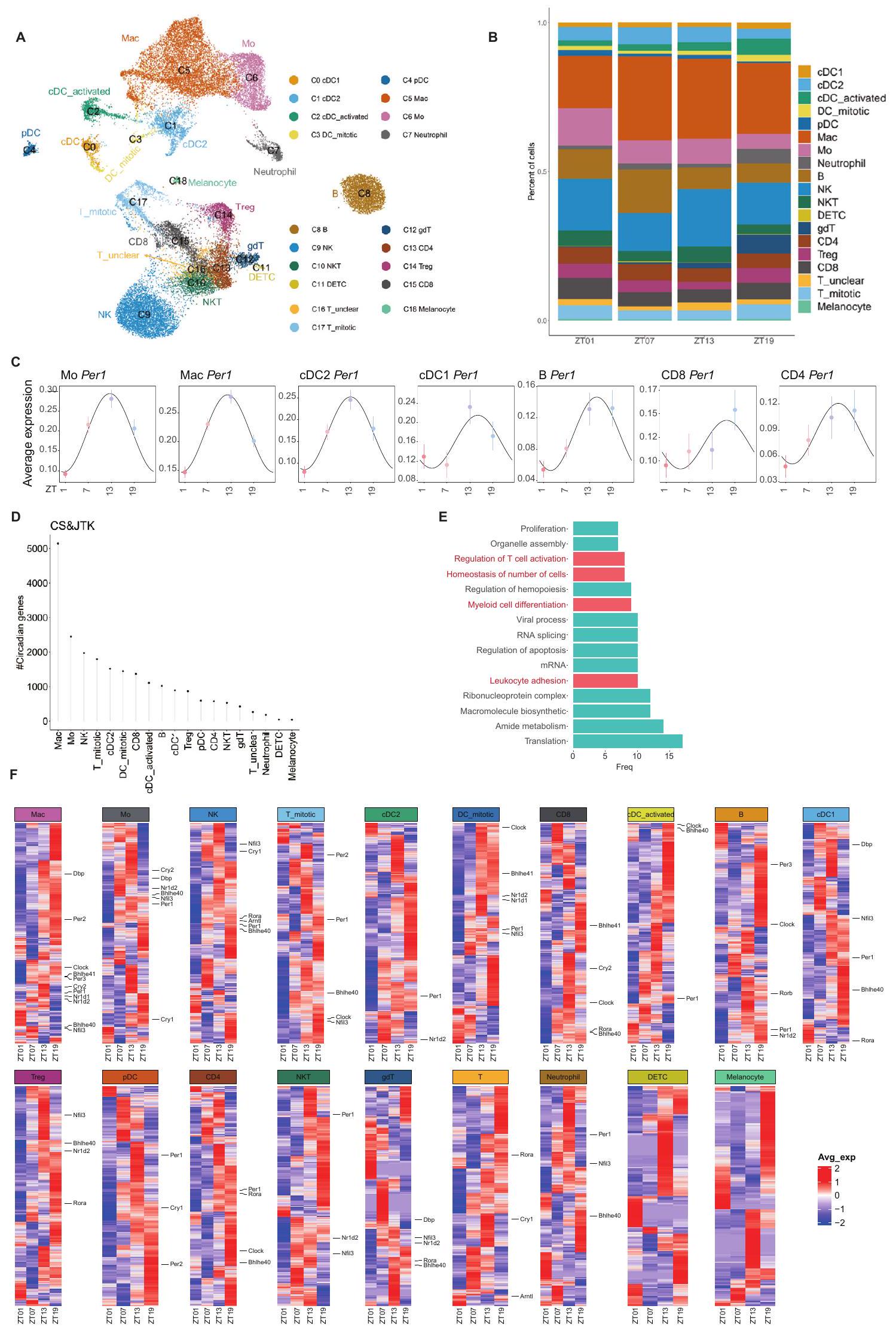 (B) Relative abundance of immune cells per cluster across different times of the day.