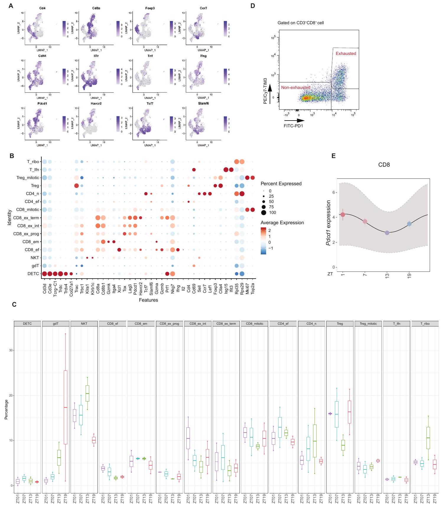 (A and B) Feature plot and dot plot of genes to identify different T cell clusters obtained by scRNA-seq of B16-F10-OVA tumors, harvested at 4 different times of the day.