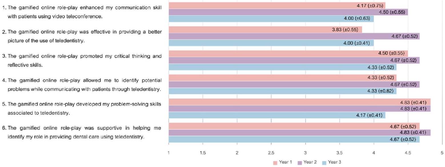 Communication skills. Participants were likely to perceive that they could learn from the gamified online role-play and felt more confident in the use of teledentistry. This educational impact was mostly achieved from the online conversation within the role-play activity, where the participants could improve their communication skills through a video teleconference platform.