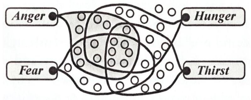 Society of mind is a reductionistic perspective of human intelligence that influenced AI greatly and argues no function directly produces intelligence. Instead, intelligence comes from the managed interaction of a variety of resourceful but simpler and non-intelligent agents. For example, when drinking a cup of tea, there activates a motor agent that grasps the cup, a balancer that keeps the tea from spreading, and a temperature sensor that confirms our throat will not be hurt. This theory sees emotional states as patterns of activation. For example, the state we call “angry” could be what happens when a cloud of resources that help you react with unusual speed and strength are activated – while some other resources that make you act prudently are suppressed (Fig. 2).