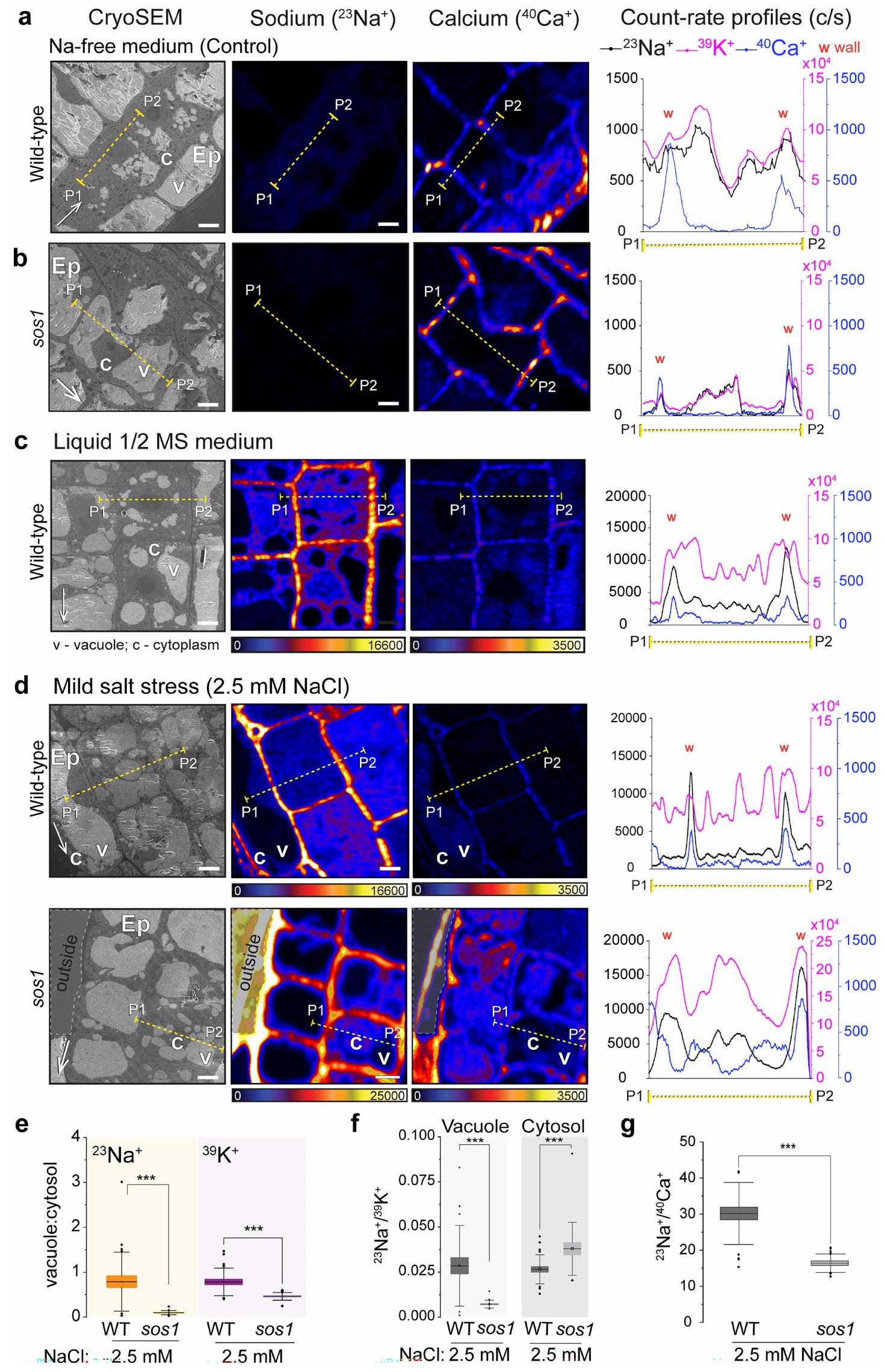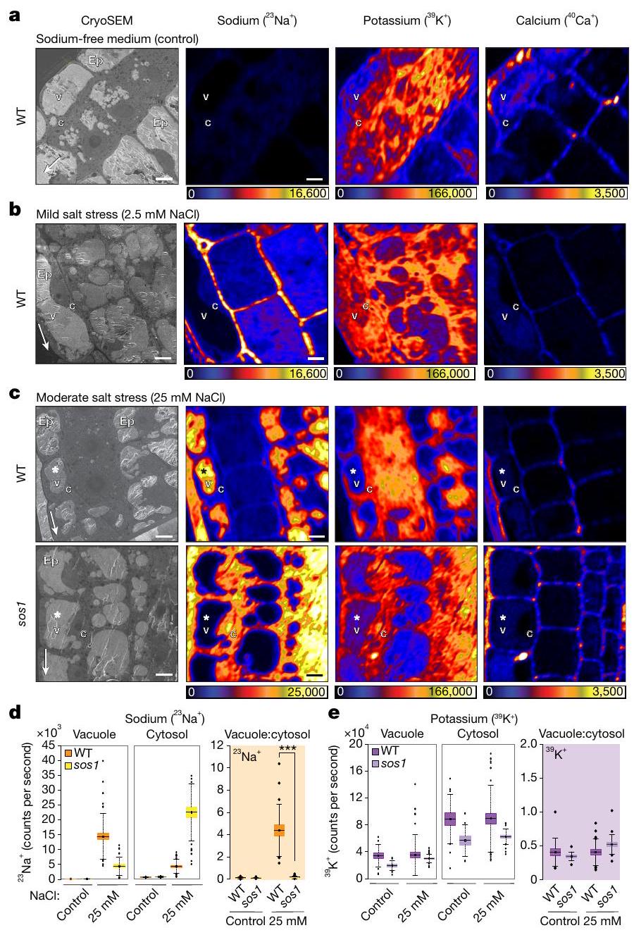 على عكس الحيوانات، فإن معظم أنواع النباتات لا تتطلب الصوديوم لأي عملية خلوية حيوية وتنمو بشكل جيد في غيابه. استخدمنا نظام هيدروبونيك مصغر لزراعة نباتات الأرابيدوبسيس، للحصول على تحكم كامل على تركيزات العناصر في الوسط (الشكل الممتد 1a). كما هو متوقع، اكتشف جهاز CryoNanoSIMS لدينا عددًا قليلاً فقط من الصوديوم عندما نمت الشتلات في وسط خالٍ من الصوديوم (شرط التحكم) (الشكل 2a والشكل الممتد 2a). على النقيض من ذلك، تم ملاحظة مستويات منخفضة من الصوديوم (وسط MS نصف القوة، تقريبًا 0.1 مليمول“; الشكل البياني الموسع 2c) ومستويات الصوديوم المرتفعة قليلاً (2.5 مليمول NaCl؛ الشكل 2b، الشكل البياني الموسع 2d) أدت إلى زيادة قوية في الصوديوم في جدار الخلية (الشكل البياني الموسع 2g)، ووجود نسبي منخفض، ولكنه قابل للاكتشاف بوضوح، للصوديوم في السيتوسول (الشكل البياني الموسع 2e، f). وهذا يشير إما إلى تصدير نشط للصوديوم، أو امتصاص محدود للصوديوم كآلية تحافظ على مستويات منخفضة من الصوديوم في السيتوسول تحت ضغط الملح الخفيف. يعتبر مضاد الصوديوم/البروتون SOS1/NHX7 من عائلة مضادات النقل NHX محددًا رئيسيًا لتحمل الملح في الأرابيدوبسيس. يتم التعبير عنه بقوة في قمة الجذر التي قمنا بالتحقيق فيها ويعتقد أنه يعمل عند الغشاء البلازمي لطرد الصوديوم إلى جدار الخلية.من المثير للاهتمام أنه حتى عند هذه التركيزات المنخفضة من الصوديوم (2.5 مليمول NaCl)، أظهر طافرة من SOS1 (sos1-1؛ sos1 من الآن فصاعدًا) زيادة في نسب Na:K في السيتوسول وانخفاض في نسب Na:Ca في جدار الخلية، مما يتماشى مع وظيفة SOS1 في تصدير الصوديوم عند هذه التركيزات (البيانات الموسعة الشكل 2d-g).