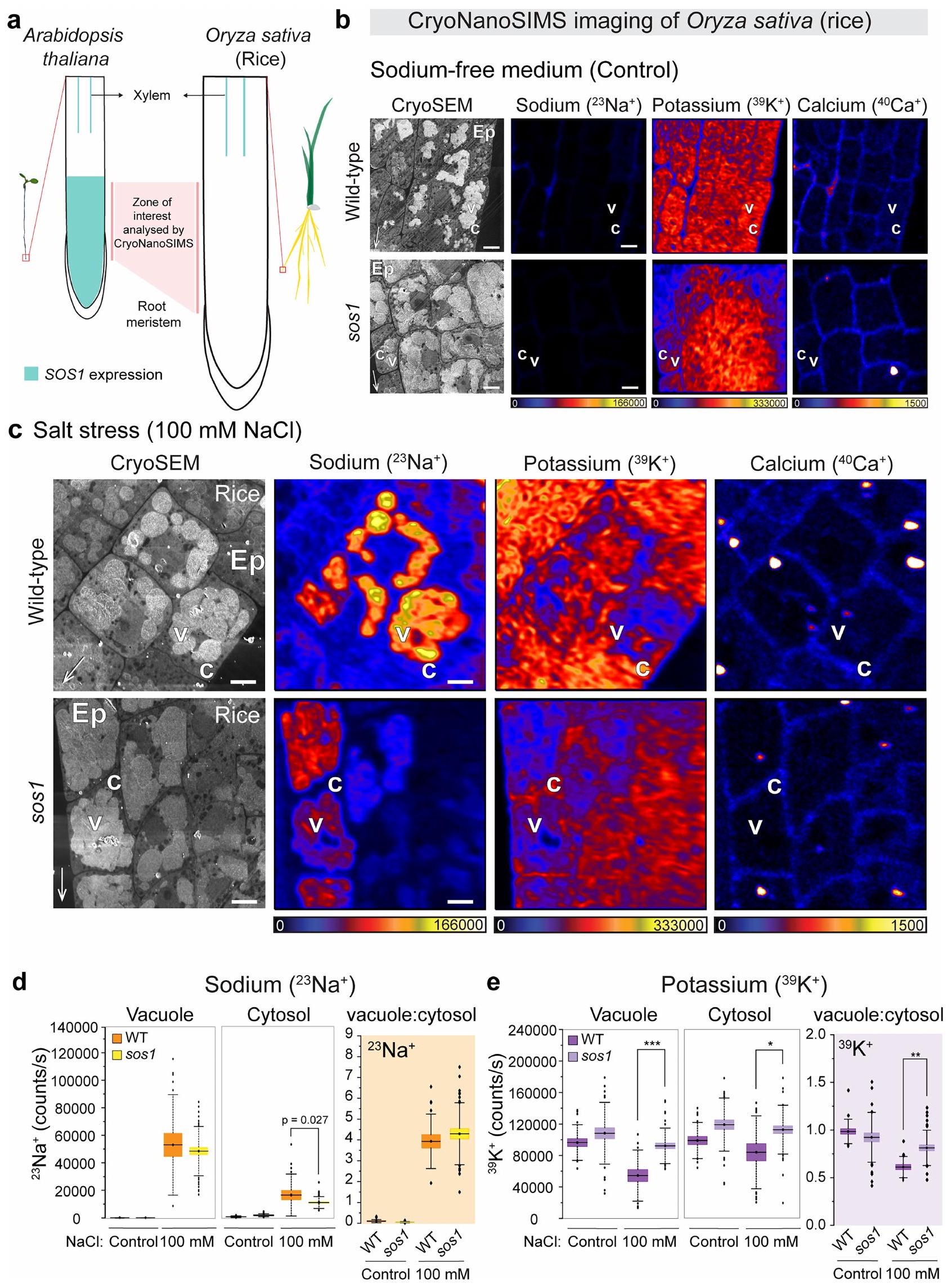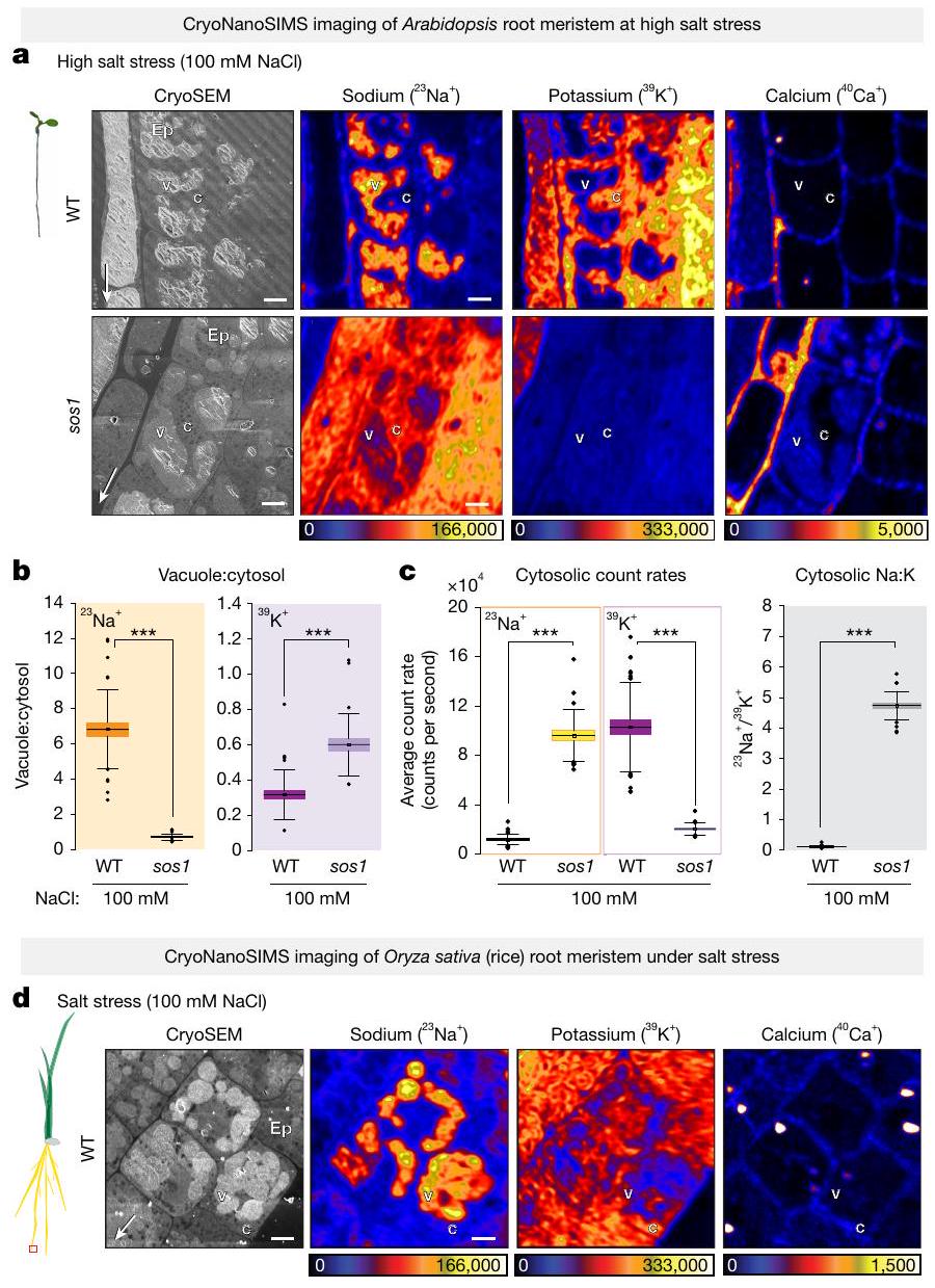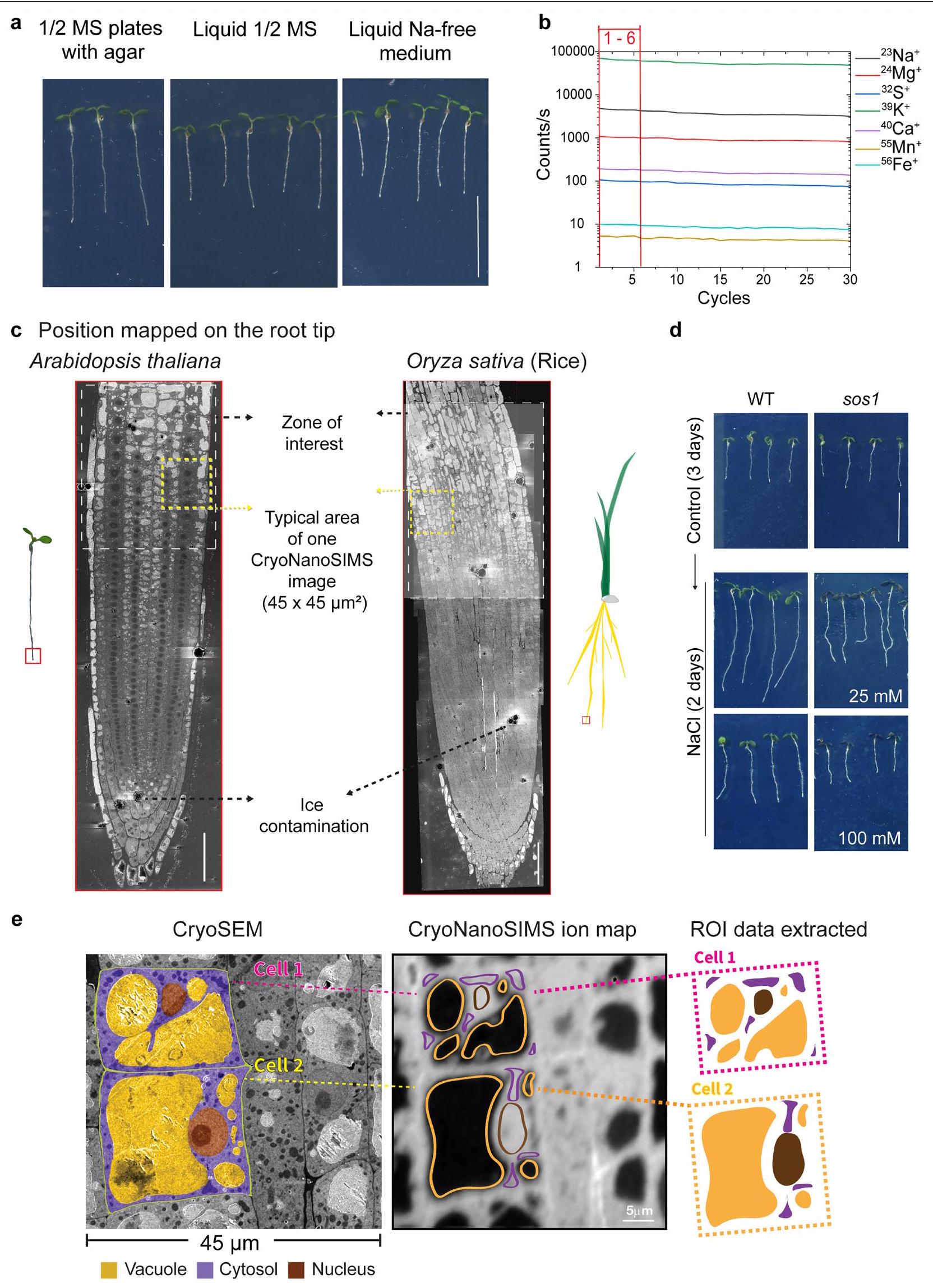 هنا قمنا بإجراء تصوير متزامن باستخدام cryoSEM وCryoNanoSIMS لتسليط الضوء على الآليات الخلوية التي تكمن وراء استجابة النباتات لإجهاد الملح (الشكل 1a-c). نستخدم قمم الجذر من الأرابيدوبسيس ثاليانا (الأرابيدوبسيس) كنموذج، ولكننا نوضح أيضًا قابلية تطبيق تقنيتنا على الأرز (Oryza sativa)، وهو محصول عالمي، حيث نؤكد نتائجنا الرئيسية. تحمل قمم الجذر مجموعات خلايا الجذعية الحيوية التي تنشأ منها جسم الجذر بالكامل. تستكشف مناطق جديدة من التربة ومن المحتمل أن تكون أول من يواجه، ويتعامل محليًا مع، تركيزات الصوديوم المفرطة. لذلك، فإن قدرة قمم الجذر على طرد أو تقسيم الصوديوم هي عامل رئيسي في قدرة النبات على الحفاظ على النمو عند ملوحة التربة المعطاة.