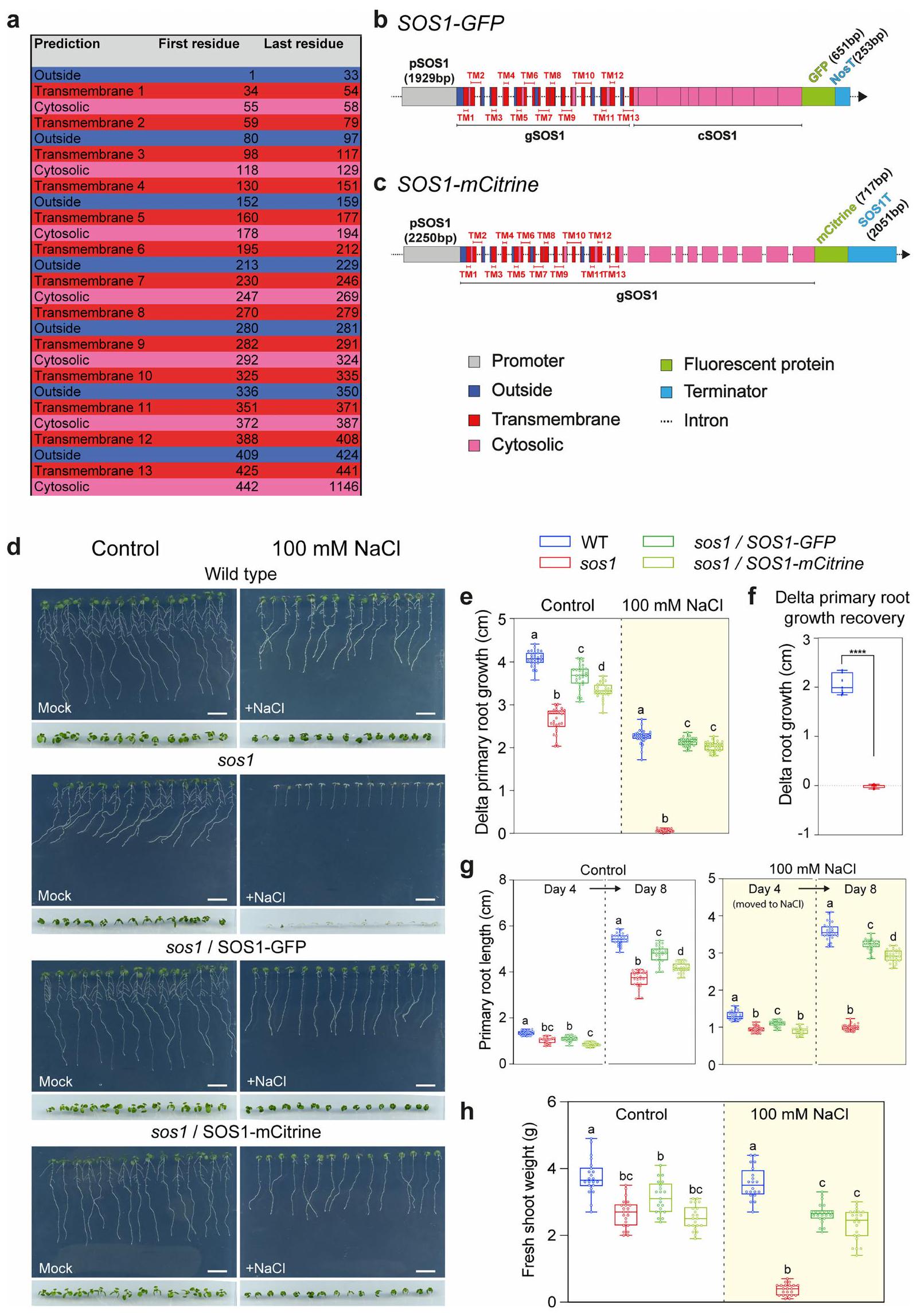 لقد كان يُعتقد منذ فترة طويلة أن SOS1 محصور فقط في الغشاء البلازمي.حيث يقوم بوساطة تصدير الصوديوم إلى جدار الخلية. ومع ذلك، تظهر بياناتنا أنه، تحت تركيزات مرتفعة من الصوديوم، يلعب بروتين SOS1 دورًا رئيسيًا في تراكم الصوديوم في الفجوات (الأشكال 2 و 3). تظهر بيانات هيكلية جديدة أن SOS1 هو بروتين يمتلك 13 مجالًا عبر الغشاء، مع طرف N خارجي وطرف C سيتوبلازمي. (الشكل 5a من البيانات الموسعة). المعرفة الحالية بموقع SOS1 تعتمد بالكامل على التعبير المفرط عن هياكل الاندماج cDNA الفلورية في خلفية WT. لذلك قمنا بإنشاء بنائين جينيين مستقلين من SOS1. احتوى أحدهما على منطقة محفز بطول 1,929 زوج قاعدي مرتبطة بتسلسل الترميز، بما في ذلك الـ 13 إنترون الأول، ومُنهٍ من نوع نوبالين (NOS) وعلامة بروتين فلوري أخضر (SOS1-GFP). بينما كان الآخر أكبرشريحة المحفز مع العدد الكامل من الإنترونات وشريحة النهاية 3’UTR من SOS1 (SOS1-mCitrine) (الشكل 5b,c من البيانات الموسعة). في شتلات الأرابيدوبسيس، أكملت كلا التركيبين المدمجين بشكل كبير ظاهرة حساسية الملح لـ sos1 (الشكل 5d-h من البيانات الموسعة) وأعطت توطينًا فرعيًا مشابهًا جدًا.