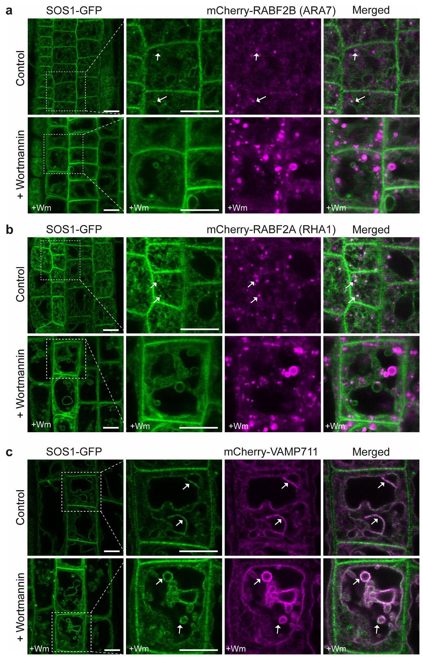 Extended Data Fig. 7| SOS1-GFP colocalized with RABF2A and RABF2B in swollen Wortmannin-induced prevacuolar structures in Arabidopsis. a-b. Partial association of SOS1-GFP was observed with late endosomal/prevacuolar markers mCherry-RABF2B (ARA7) (a) and mCherry-RABF2A (RHA1) (b), under untreated (control) conditions and was distinct upon Wortmannin (Wm) treatment. Arrows show representative points. c. Strong colocalization of SOS1-GFP with mCherry-VAMP711 was induced by Wm treatment, confirming