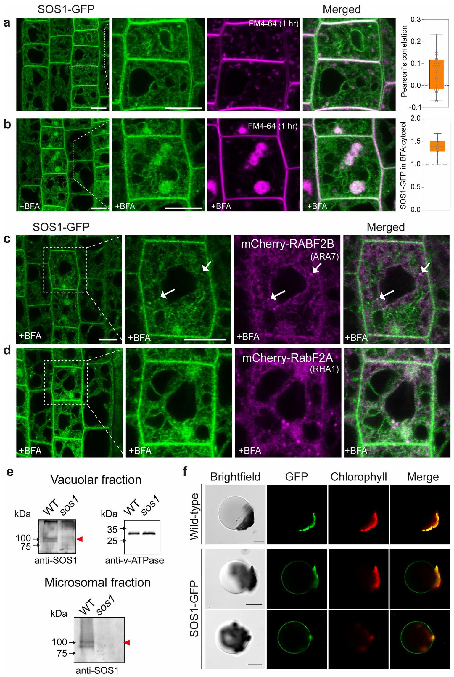 (red arrow), detected in the vacuolar fraction. The vacuole marker v-ATPase was detected using commercial antibodies. Blots are representative of two biological replicates. Refer to Supplementary Fig. 1 for original blots. f. SOS1-GFP localization to the tonoplast observed in intact vacuoles extracted from leaf tissue. Vacuoles from non-transformed WT plants are shown as negative control. Images of transmitted light (left), GFP fluorescence (centre) and merge of both (right). Images are representative of three biological replicates. Box plot represents Pearson’s correlation coefficient. For (a) control roots; quantification vesicles from root meristem cells from 4 plants; for BFA treated roots; quantification, cells from 4 plants. Box plots show centrelines medians; box limits indicate the 25th and 75th percentiles; whiskers extend to the minimum and maximum. For (c) BFA treated roots; (d) BFA treated . Images are representative confocal images of 7 day old seedlings grown on MS plates in growth condition 1 . Scale bars, ((a-d)(overview), f), (a-d)(inset)).