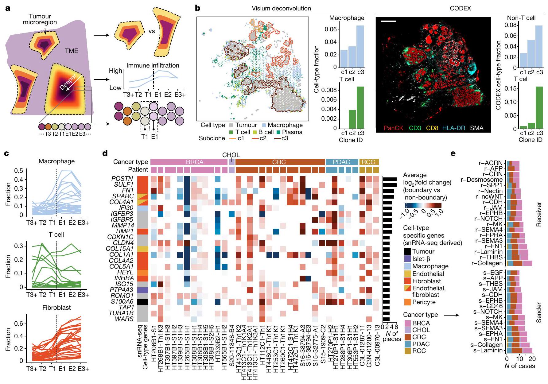 استخدمنا التعيينات الطبقية الموصوفة أعلاه لتحديد ما إذا كان التسلل يظهر أنماطاً مكانية، وحددنا ست مناطق مرتبة من مركز الورم إلى TME: T3+، T2، T1، E1، E2 وE3+. أظهرت هذه الاتجاه التنازلي المتوقع لخلايا الورم (بيانات موسعة الشكل 9ب)، ولكن أنماط مختلفة للخلايا غير الورمية. تجمعت البلعميات خارج الورم في E1 وE2، بينما أظهرت خلايا T تسللاً مباشرة خارج (E1 وE2) وداخل الورم (T1 وT2) (الشكل 3ج). كانت كل من نسب البلعميات وخلايا T منخفضة في TME البعيد (الطبقة E3+) حيث تهيمن الخلايا الليفية، وهو ملاحظة مدعومة ببيانات CODEX (بيانات موسعة الشكل 9ج). مع مسافة بين الطبقات تبلغ فقط، تشير ملاحظتنا إلى أن هناك تجنيداً مكانياً قوياً للخلايا المناعية بواسطة الأورام على المستوى المجهري.