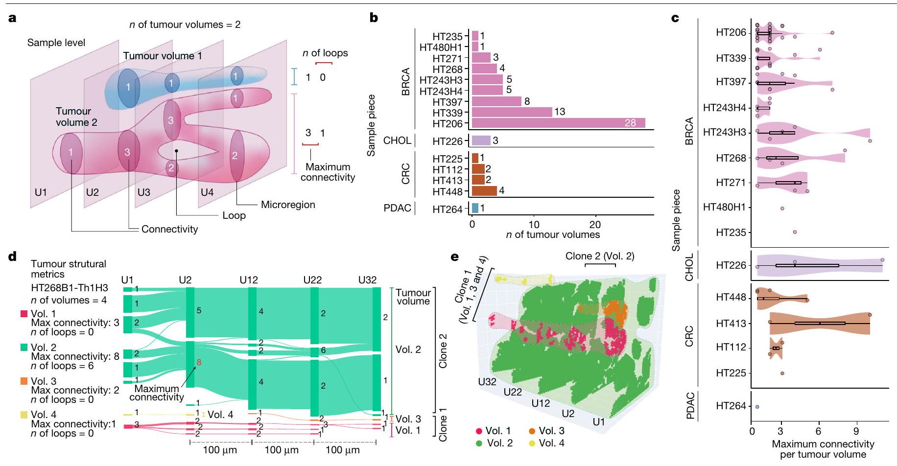 اخترنا عينة نقيلة كبدية من BRCA، HT268B1-Th1H3، لإعادة بناء حجم ثلاثي الأبعاد وتحليل هيكلي مفصل. احتوت هذه العينة على أربعة أحجام ورمية (الحجم 1 إلى الحجم 4) (الشكل 4د، هـ). شكلت الأحجام 1 و3 و4 أحجام فرعية منفصلة داخل النمط الفرعي 2، والتي من المحتمل أن تكون متصلة بما يتجاوزتم فحص قسم الأنسجة. كان الحجم 2، وهو أكبر وأعقد حجم، يخص فقط النسخة 1، مع أقصى اتصال يبلغ 8 و6 حلقات، مما يدل على تفرع ودمج كبيرين (الشكل 4d). أكدت الصور النسيجية لـ HT268B1 (البيانات الموسعة الشكل 2a-e) وجود انقسام ودمج مرئيين، مما يوضح أن الأورام حتى بدون هياكل قنوية أو فصية واضحة يمكن أن تظهر أنماط نمو متنوعة وسلوك غازي وتفرع معقد.