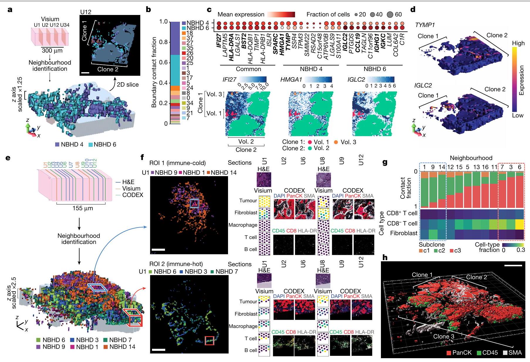 وأربعة أقسام من CODEX تمتدالأحياء التي تم وصفها في TMEيتم عرضها كحجم ثلاثي الأبعاد. تصور منطقتين من الاهتمام في HT397B1، تحديدًا المنطقة الأكثر برودة مناعيًا ROI 1 والمنطقة الأكثر حرارة مناعيًا ROI 2. يتم عرض شرائح ثنائية الأبعاد من الحجم ثلاثي الأبعاد مع مناطق مجاورة مميزة بالربع المرتبطة بكل منطقة من الاهتمام. يتم عرض شرائح Visium ST (U1 و U8) كنسب نوع الخلايا المحسوبة بواسطة RCTD. بالنسبة لشرائح CODEX (U2 و U6 و U9 و U12)، يتم عرض DAPI و pan-cytokeratin (PanCK) و SMA و HLA-DR و CD45 و CD8. شريط القياس، تُعرض أحياء TME كنسبة من الاتصال بحدود كل من الثلاثة تحت الأنواع. بالإضافة إلى ذلك، نسبة نوع الخلية منوتم عرض الخلايا والألياف. تم حساب كسور نوع الخلايا من مقاطع CODEX. تم التأكيد على الربعين العلوي والسفلي من الأحياء بالنسبة لكسرة الاتصال مع السلالة الفرعية 3 كصناديق متقطعة. h، تم إنشاء أحجام السطح الظهاري ثلاثي الأبعاد (PanCK، أحمر)، المناعي (CD45، أخضر) واللحمي (SMA، أبيض) من مقاطع CODEX. مقياس الرسم،. أنماط النسخ المرتبطة بعمق خلايا السرطان من حافة الميكرومنطقة، بالإضافة إلى التعبير الجيني المحدد الغني في خلايا الحافة المجاورة لخلايا المناعة في البيئة المجهرية للورم. أخيرًا، حددت إعادة بناء حجم الورم ثلاثي الأبعاد الجوار ثلاثي الأبعاد لتنوع البيئة المجهرية الإقليمية.