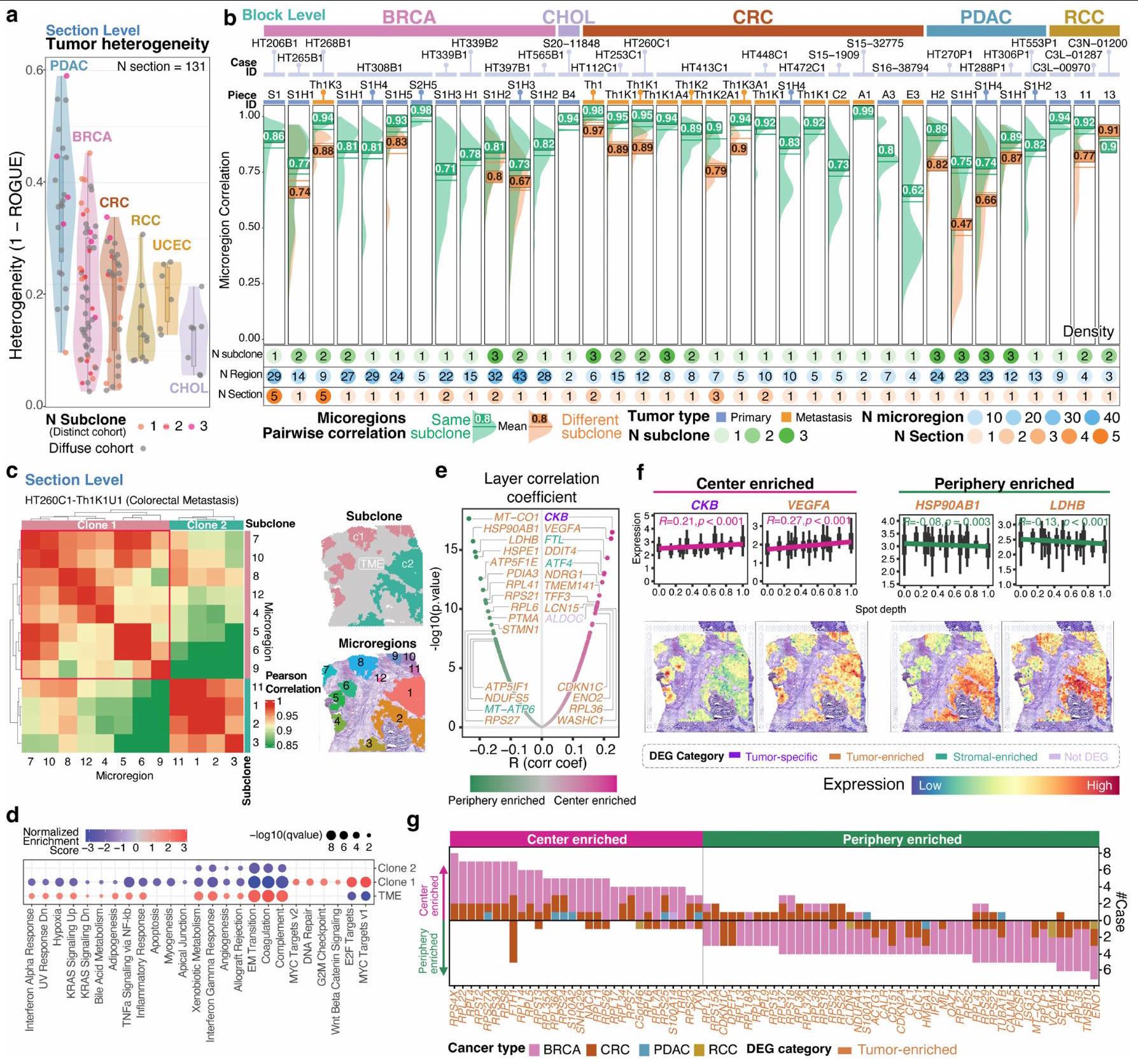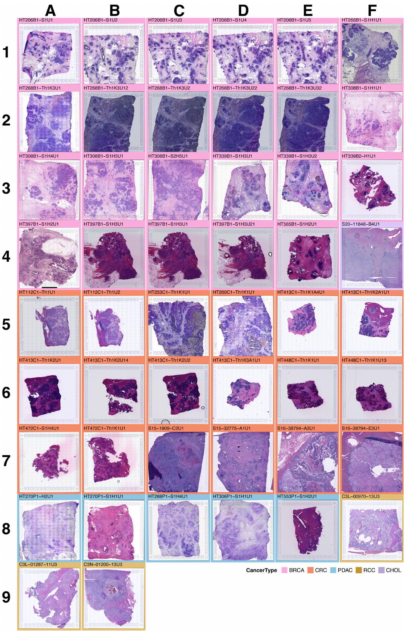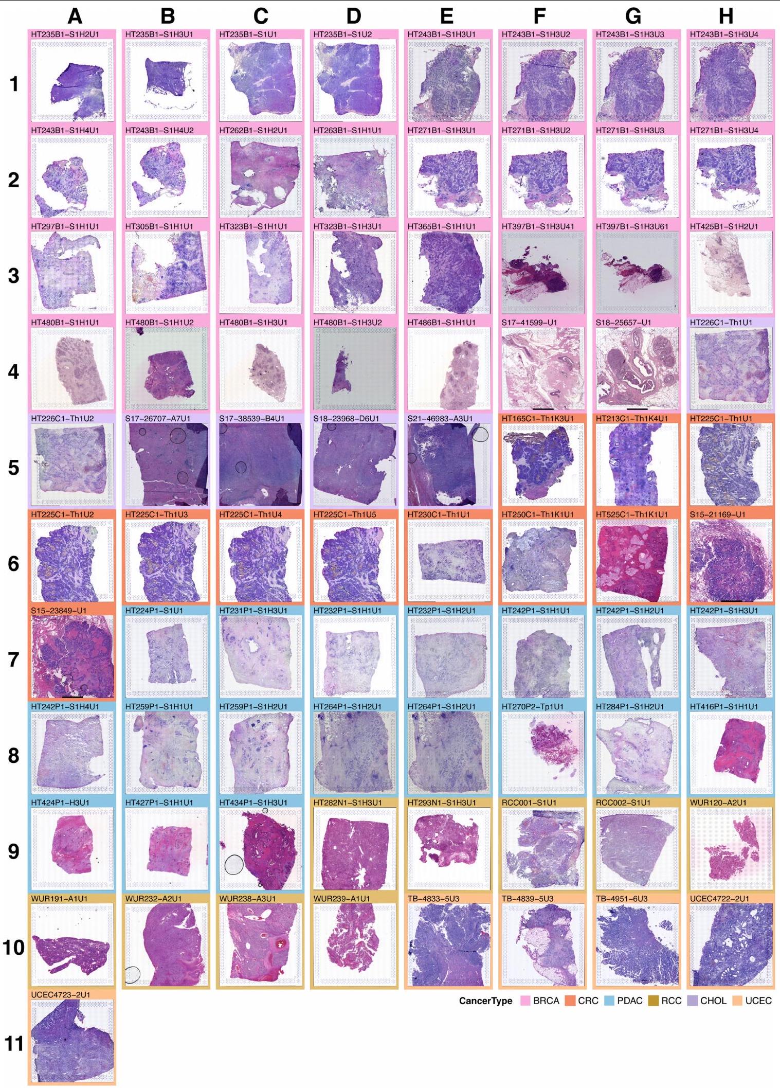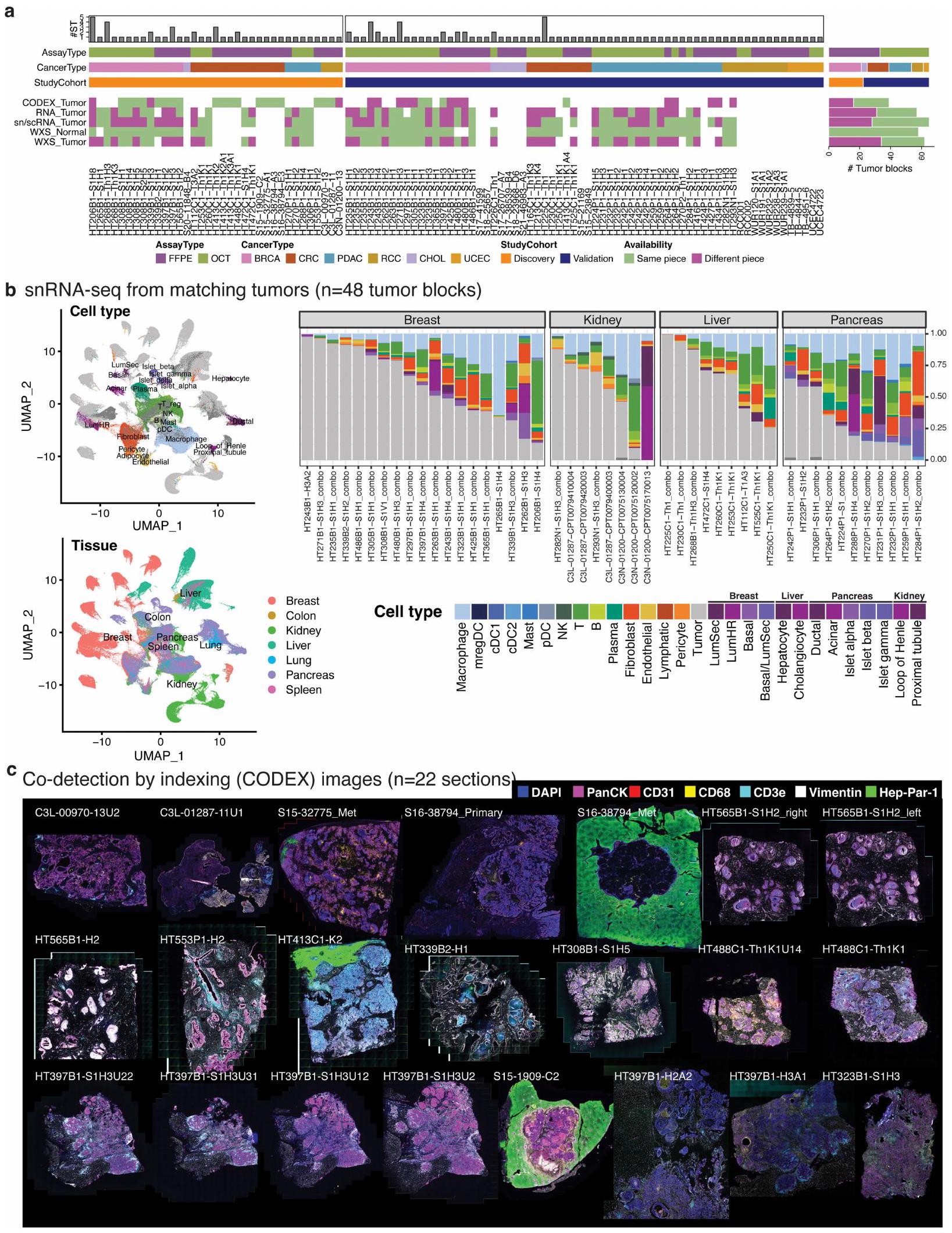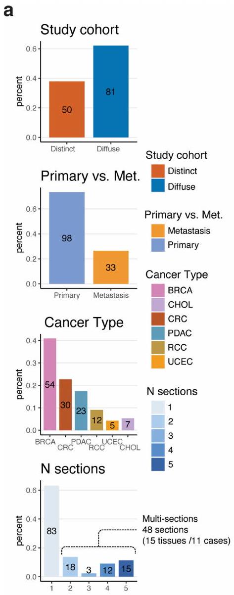 قمنا بتوصيف 131 مقطع ورمي مع بيانات ST من 98 كتلة تغطي 6 أنواع من السرطان كجزء من شبكة أطلس الأورام البشرية التابعة للمعهد الوطني للسرطان: 54 BRCA، 30 CRC، 23 PDAC، 12 RCC، 5 UCEC و7 CHOL (الشكل 1أ، الشكل البياني الممتد 1 والجدول التكميلي 1) من 78 حالة ( و6 حالات، على التوالي). كانت ثلاث عينات من RCC من العيادة