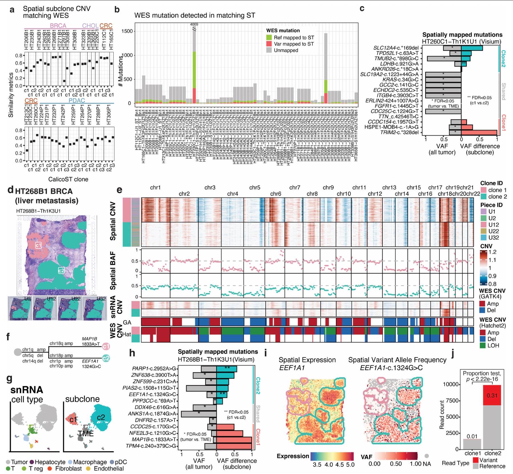 عينة HT260C1 (نقائل الكبد CRC) احتوت على 12 منطقة ميكروية للورم، والتي تم رسمها إلى 2 من تحت الأنماط المكانية (الشكل 2d). تم تحديد وتأكيد كلا الحدثين النسليين (تكبير الكروموسوم 13 وحذف الكروموسوم 8p)، بالإضافة إلى عدة أحداث تحت نسيلية (تكبيرات في الكروموسومات 6p و12p و20q في النمط c2، وتكبير الكروموسوم 12q في النمط c1)، مع بيانات تسلسل RNA أحادي النواة المتطابقة (snRNA-seq) واستنتاج CNV القائم على WES (الشكل 2e، f). على الرغم من أن علم الأنسجة أشار إلى وجود فصل ليفي بين النمطين الفرعيين، إلا أن العديد من CNVs النسيلية المشتركة اقترحت أصلًا مشتركًا (الشكل 2g). قدمت المتغيرات الجسدية من النسخ مزيدًا من الأدلة الداعمة لنسيلية الورم. بالإضافة إلى ذلك، تم رسم 17 طفرة جسدية قائمة على WES إلى ST (الشكل 5c من البيانات الموسعة). أظهرت عدة طفرات تباينًا في تردد الأليل المتغير (VAF) في مناطق الورم مقارنة بالمناطق الطبيعية (الشكل 5c من البيانات الموسعة، اليسار) وتباينات VAF بين النمطين الفرعيين (الشكل 5c من البيانات الموسعة، اليمين). أظهر كلا النمطين الفرعيين تعبير، وVAF للطفرات ج. كان أعلى بشكل ملحوظ في السلالة الفرعية c2 مقارنة بـ c1 (الشكل 2h,i؛اختبار النسبة ذو الجانبين). باستخدام بيانات زينيوم، قمنا بتحليل كل منالنمط البري (WT) و c.الأليلات في قسم الورم المتطابق، الأليل WT في كلا السلالات الفرعية والأليل الطافر في السلالة الفرعية c2 (الشكل 2j). انحرفت السلالة الفرعية c2 عن c1، مع اكتساب تغييرات جينية فريدة في كل من CNV والطفرات. وبالمثل، أظهر عينة نقيلة كبدية من BRCA، HT268B1، سلالتين فرعيتين متميزتين مكّنت من دعمها بواسطة بيانات snRNA-seq المتطابقة، مع اختلافات في CNV على مستوى الذراع الكروموسومي (الشكل التمديدي 5d-g) وطفرات فرعية (الشكل التمديدي 5h). على سبيل المثال، تم التعبير عن EEF1A1 في كلا السلالتين الفرعيتين، في حين كانت الطفرة EEF1A1 1324G.تمت ملاحظته بشكل خاص في السلالة الفرعية c2 (اختبار النسبة FDR < 0.05؛ الشكل التوضيحي الممتد 5i،j).