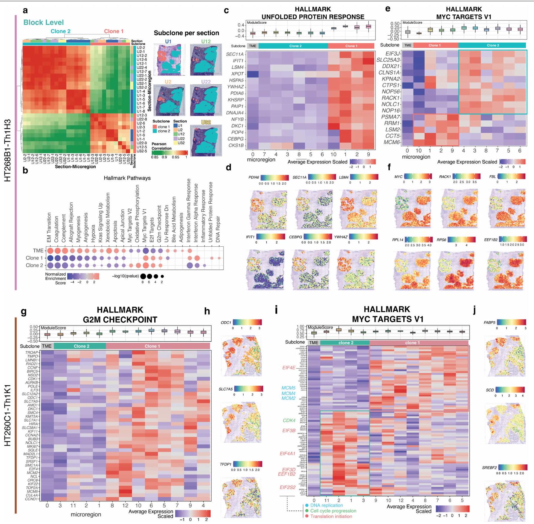 عند تطبيق GSEA لتحديد المسارات الخاصة بالنسائل الفرعية، وجدنا مستويات تعبير ميكروإقليمية متباينة ضمن مسار نقطة التفتيش G2M في النسيلة 1 (البيانات الموسعة الأشكال 6d و7g,h، المشار إليها بالصناديق المنقطة) في العينة HT260C1. تم عكس هذا النمط في MYC لكل من عينات النقائل HT260C1 وHT268B1، مع مجموعات متميزة من جينات MYC السفلية بين النسائل الورمية (البيانات الموسعة الشكل 7e,f,i,j والشكل التكميلي 3). تؤكد هذه النتيجة على تعقيد هذا المسار، الذي يتم تنظيمه بشكل غير طبيعي في السرطان ويؤثر على العديد من العمليات المسرطنة.النسخة 2 من HT260C1 كانت زيادة في معقد بدء الترجمة (عائلة eIF) وتقدم G1S (CDK4)، في حين أن النسخة 1 كانت تحتوي على جينات تكرار الحمض النووي (عائلة MCM) (الشكل 7i من البيانات الموسعة).