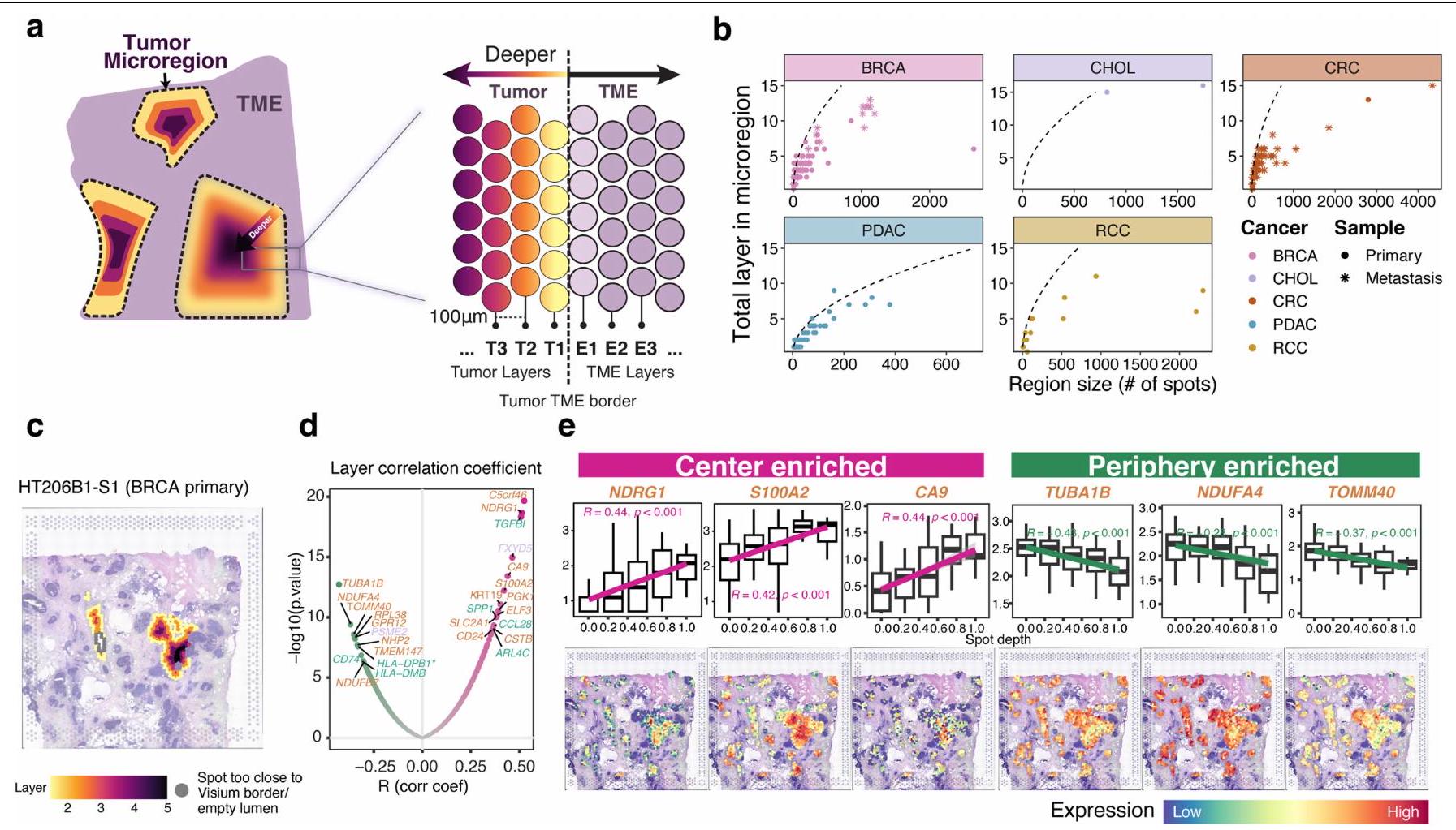 قمنا بمزيد من التحقيق لمعرفة ما إذا كانت هناك برامج نسخ مختلفة موجودة في مراكز الميكرو منطقة الورم (النوى) مقارنةً بحوافها (الواجهات بين الورم والـ TME-ستروما). لهذا الغرض، استخدمنا Morph لقياس المسافة من كل بقعة ورم إلى أقرب حدود ورم-TME (الطرق والبيانات الموسعة الشكل 8a). العلاقة بين عمق الطبقة الكلي لميكرو المنطقة وحجمها (المساحة الكلية المقاسة بعدد البقع المشغولة) تصف الشكل العام للمنطقة (البيانات الموسعة الشكل 8b). تشير الخط المرجعي المتقطع إلى علاقة العمق-الحجم للمناطق الدائرية المثالية. بالنسبة لجميع أنواع السرطان الخمسة في المجموعة المكانية المتميزة ( )، كانت المناطق الأصغر تميل إلى إظهار أشكال قريبة من الدائرة. ولكن مع زيادة عمق الطبقة، كانت المناطق تميل إلى الانحراف عن شكلها الدائري، وظهرت واجهة موسعة بين خلايا الورم وخلايا غير الورم.