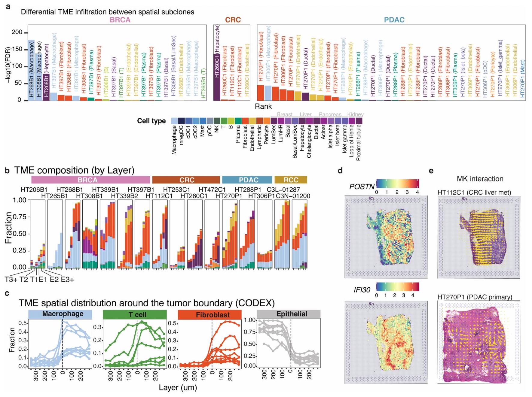 قمنا أيضاً بإجراء تحليل التعبير التفاضلي بين المناطق الحدودية T1 وE1 ومع جميع النقاط الأخرى (الشكل 3د). كانت الجينات الحدودية العليا المشتركة عبر العينات وأنواع السرطان تشمل جينات بروتينات مصفوفة خارج الخلية (POSTN و) وبروتينات تنشيط البلعميات المستحثة بواسطة الإنترفيرون (IFI3O) (بيانات موسعة الشكل 9د). أظهرت بيانات snRNA-seq المطابقة أن الجينات الحدودية العليا كانت لها تعبير أعلى بشكل ملحوظ (تم تعديل، تصحيح بونفيروني) عبر المجموعة في أنواع خلايا غير ورمية (POSTN، FN1 وTIMP1 في الخلايا الليفية وIFI3O في البلعميات)، مما يشير إلى أن هناك تفاعلات بين خلايا الورم وغير الورم عند الحدود (الشكل 3د). لتحديد CCIs المكانية، قمنا بتشغيل COMMOT على 18 حالة مع 39 مقطعاً ثم تمييزنا إشارات المرسل-المستقبل التفاضلية بين النقاط داخل وخارج مناطق حدود الورم. كانت CCIs المشتركة العليا في المناطق الحدودية هي مستقبلات مصفوفة خارج الخلية (ECM) (الكولاجين، اللامينين، FN1 وTHBS)، الإشارات المفرزة (SEMA3، SEMA4، ncWNT وMK) والتصاق الخلايا (EPHB وNOTCH) (الشكل 3هـ). كمثال، تم ملاحظة مسار MK في عينات CRC وPDAC وBRCA، حيث تنتقل الإشارة من مناطق الخلايا الخبيثة إلى واجهة TME (بيانات موسعة الشكل 9هـ). شمل المسار تفاعلات بين الليغاند MDK والمستقبلات NCL وSDC4 (مرجع 26). تفرز الخلايا الخبيثة MDK لإنشاء بيئة مثبطة للمناعة وعائية، مما يعزز بدوره نمو الورم. وجدنا أيضاً مسارات ECM التي تنتقل فيها الإشارة من TME نحو مناطق الخلايا الخبيثة. واحدة من التفاعلات العليا، مسار THBS، تصف مكونات ECM THBS1-THBS4 (التي تشفر الثرومبوسبوندين) ترتبط بمستقبلات سطح الخلية CD36 وCD47، مما يعدل بدوره التصاق الخلايا، التكاثر وتكوين الأوعية. توضح زيادة الخلايا المناعية المرتبطة بالورم، الجينات وCCIs داخل-wide المناطق الحدودية التواصل بين الخلايا الخبيثة وبيئتها التي ستكون غير مرئية للتقنيات غير المكانية.