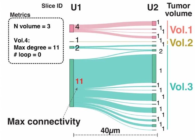 ثم قمنا بتحليل هذه الأحجام الورمية من حيث التعقيد الهيكلي باستخدام مقياسين طوبولوجيين رئيسيين: (1) الاتصال (الدرجة)، الذي يقيس عدد الاتصالات بالمناطق المجاورة، و(2) عدد الحلقات لكل حجم، الذي يشير إلى الحالات التي تنقسم فيها المقاطع المجاورة وتندمج لتشكيل هياكل على شكل كعكة. تعتبر أعلى درجة اتصال مؤشراً على تعقيد الهيكل الورمي. من بين 15 حجم ورم تم تحليله، كان لدى 8 (6 BRCA، 1 CHOL و1 CRC) درجة اتصال قصوى تتجاوز 5، مما يعكس التكوين المتكرر لهياكل متفرعة معقدة في هذه الأورام (الشكل 4ج). تم ملاحظة أعلى درجة اتصال تبلغ 11 في عينة CHOL HT226C1-Th1، والتي نتجت عن حجم مدمج كبير في U1 الذي تفتت إلى ميكرو مناطق أصغر في المقطع المجاور U2 (بيانات موسعة الشكل 10أ، ب). بالإضافة إلى ذلك، احتوت 5 من 81 حجم عبر 15 قطعة ورمية على هياكل حلقة معقدة، مع أعلى عدد حلقات يبلغ 12 موجود في الحجم 14 من العينة