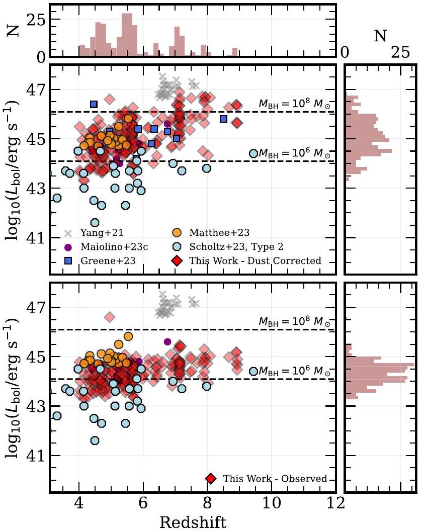 على الرغم من وجود تلميحات مبكرة أيضًا في الأعمال السابقة (Morishita et al. 2020; Fujimoto et al. 2022; Endsley et al. 2023)، فإن واحدة من أكثر الاكتشافات إثارة للاهتمام من تصوير JWST المبكر هي تلك المصادر الحمراء المدمجة مع -شكل” توزيع الطاقة الطيفية (SED) – وهو عبارة عن استمرارية زرقاء في الأشعة فوق البنفسجية ومنحدر أحمر حاد في الإطار الزمني البصري (Furtak et al. 2023a; Labbé et al. 2023a, 2023b). بينما كانت الاختيارات الفوتومترية الأولى لهذه الأجسام تشمل أهدافًا مفصولة مكانيًا يمكن أن تكون مجرات مضغوطة ضخمة مبكرة (Barro et al. 2024)، كشفت الطيفيات عن دليل واضح على وجود و/أوانبعاث يدل على الثقوب السوداء الهائلة التي تتراكم بنشاط (SMBHs؛ فوجيموتو وآخرون 2023ج؛ كيلي وآخرون 2023؛ كوتسيفسكي وآخرون 2023؛ كوكوريف وآخرون 2023أ؛ أوبلر وآخرون 2023؛ فورتاك وآخرون 2024؛ غرين وآخرون 2024؛ ماثي وآخرون 2024).