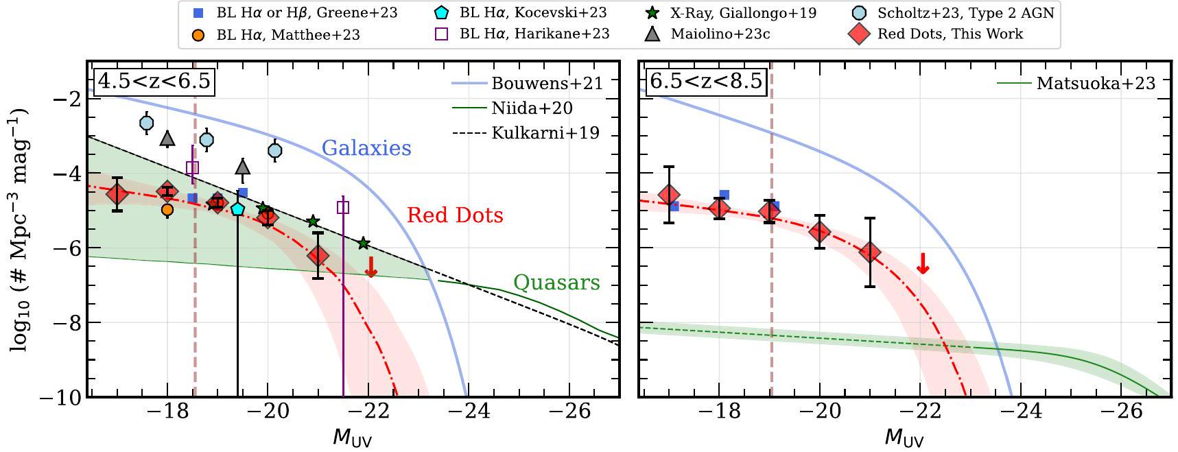 المعروفة باسم “النقاط الحمراء الصغيرة” (LRDs)، تتميز هذه المصادر بوجود SEDs فريدة من نوعها “شكل” مستمر مع مورفولوجيا مصدر النقطة الخاصة بها (Furtak et al. 2023a; Labbé et al. 2023a, 2023b). ومع ذلك، ما يجعل LRDs تبرز حقًا هو كثافتها العددية العالية. يبدو أن LRDs قد تمثل بضع في المئة من سكان المجرات فيوهي أكثر عددًا بكثير من أقل الكوازارات المعروفة من حيث اللمعان التي تم اختيارها بالأشعة فوق البنفسجية. وبالمثل، يبدو أنها تمثلمن AGN المختارة من نوع الخط العريض (BL) في (هاريكان وآخرون 2023؛ لابي وآخرون 2023أ؛ غرين وآخرون 2024؛ مايونينو وآخرون 2024)، وهو أعلى من نسبة الكوازارات الحمراء المغبرة في (بانيرجي وآخرون 2015؛ غليكمان وآخرون 2015). تُلاحظ هذه النقاط الحمراء عمومًا في (Labbé وآخرون 2023a)، ولكن يمكن أن تكون