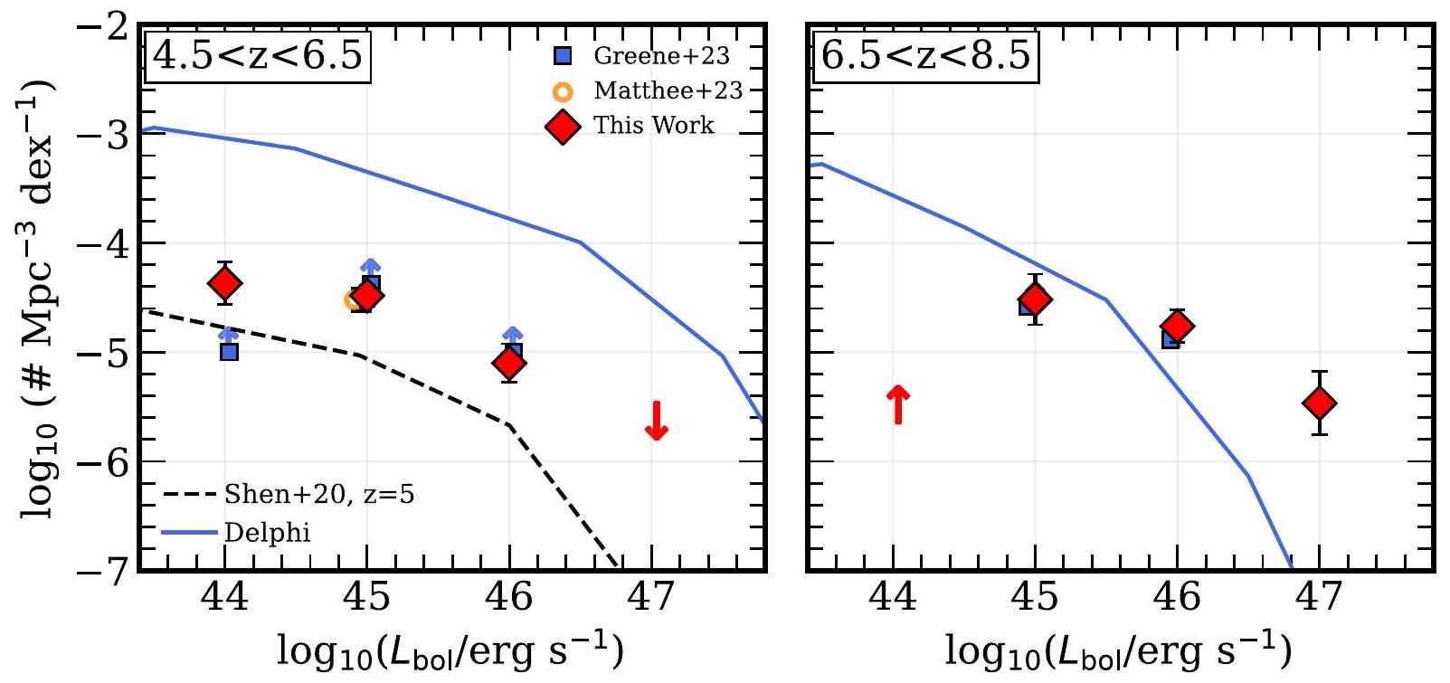Figure 5. Bolometric luminosity functions in the (left) and (right) bins, derived from , assuming the rest-frame optical continuum is AGN-dominated. The number densities have been – and completeness-corrected. The uncertainties are derived from Poisson noise (Gehrels 1986). The arrows show the upper limits on the derived number densities. The blue squares show the upper limits derived for spectroscopically confirmed LRDs in the UNCOVER data from Greene et al. (2024). In addition, in the lowest-redshift bin, we show the NIRCam grism result of Matthee et al. (2024; open circle). The dashed lines show the pre-JWST relation derived in Shen et al. (2020). Finally, the blue lines show the luminosity function from the Delphi semi-analytic models (Dayal et al. 2019) that grow SMBHs from seeds.