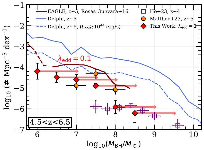 Figure 6. The SMBH mass function, assuming , of our sample in the range. The red arrows show how our mass function would change if we assumed a lower Eddington ratio of . We overlay the SMBH mass function from Matthee et al. (2024) at in orange and the HSC +SDSS-derived BH mass function from He et al. (2024) in magenta. The maroon line shows the results from the EAGLE simulation at (RosasGuevara et al. 2016). The solid and dashed blue lines show the results from the Delphi (Dayal et al. 2014, 2019, 2020) simulations for all and bright ( ) BH, respectively. The measured number densities of our LRDs agree well with the spectroscopic sample from Matthee et al. (2024) and the simulations, given .