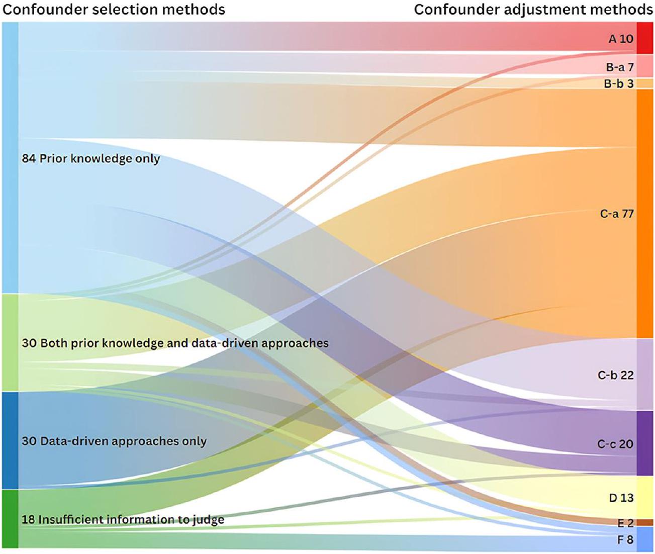 Data-driven approaches, such as univariate analysis and stepwise methods, were commonly used to select variables. These methods cannot distinguish between confounders, which require adjustment, and mediators, which do not; therefore, these methods lead to mutual adjustment among the selected variables, increasing the risk of introducing adjustment bias and producing invalid causal inferences [17]. When sample sizes are large enough, we recommend relying exclusively on knowledge-based approaches. While data-driven methods are essential for small datasets and rare events, they should be integrated with knowledge-based approaches before application.