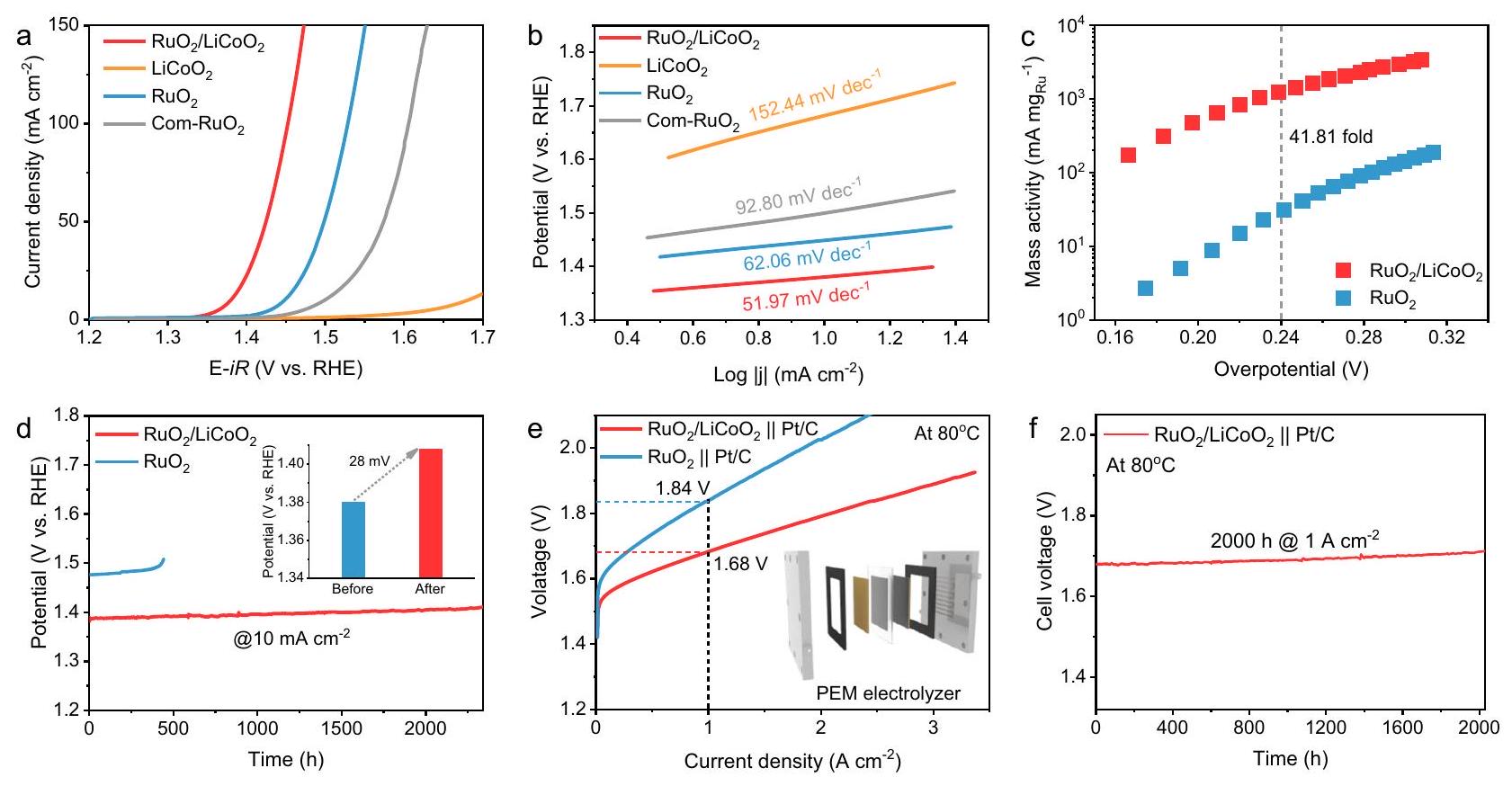 In summary, we have successfully manipulated the bonding environment of during the catalytic reaction by utilizing the dynamic reconstruction of the support to achieve a balance between activity and stability in acidic OER. Dynamic electrochemical delithiation regulates the electron distribution and coordination structure at the interface, promoting the self-optimization of the catalyst during the OER process. The weakened covalency of the Ru-O bond triggers a complete transition of the electrocatalyst from the LOM to the AEM reaction pathway, improving the catalytic stability. As a result, the electrocatalyst reaches a current density of at a low overpotential of . In particular, the PEM electrolyzer using operates stably for 2000 h at a high current density of . This work provides a