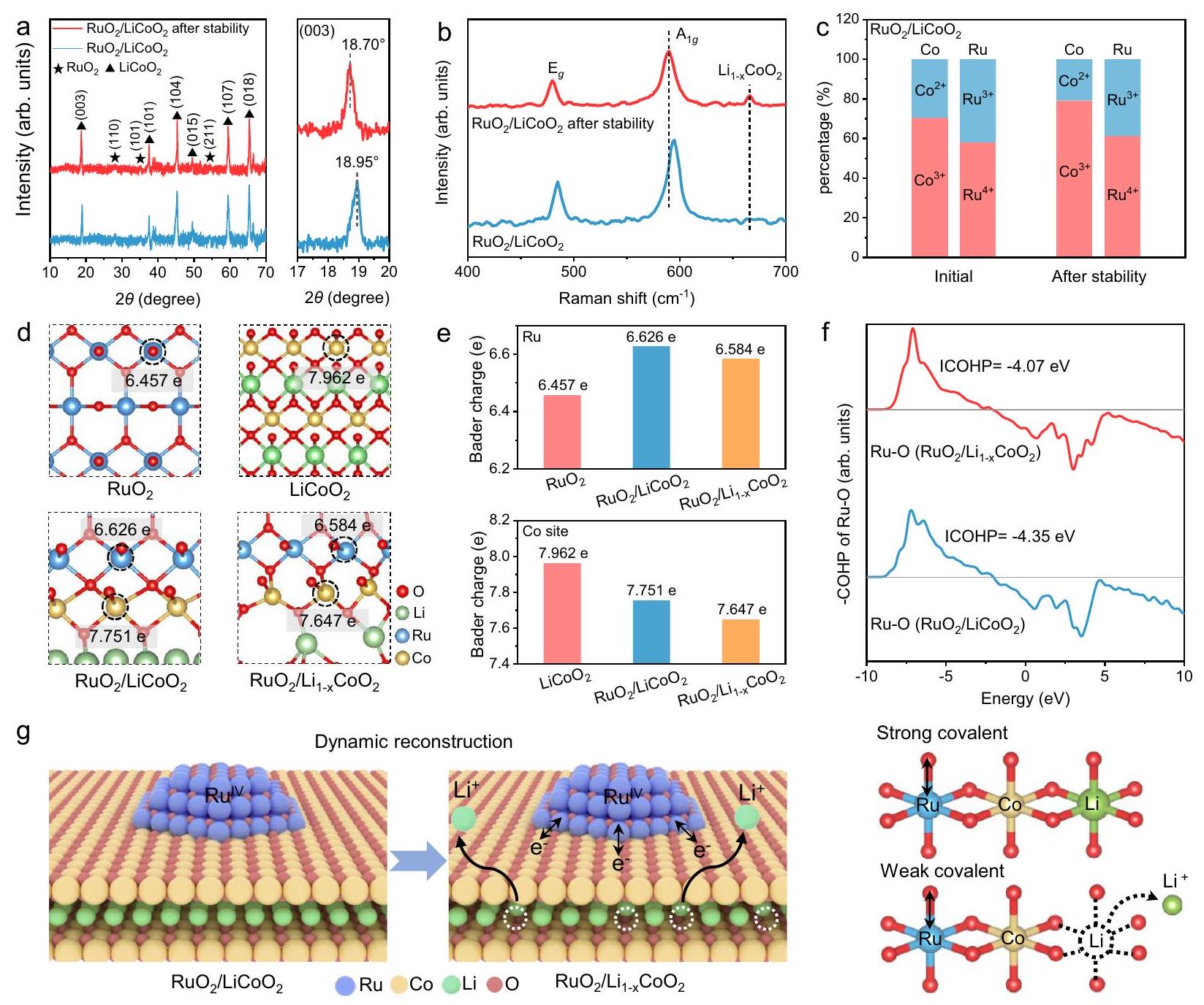 تتم تحليل الحالات الإلكترونية لـالمحفزات قبل وبعد استقرار OER لفهم تأثير عملية إعادة البناء. نسبةبعد استقرار OER تزداد مقارنة بـالأصلية، مما يعني تقليل كثافة الإلكترون لمواقع Co (الشكل 4c والشكل التكميلي 42). يؤدي الاستخراج الديناميكي لأيونات الليثيوم إلى نقل الإلكترون، مما يؤدي إلى أكسدة جزئية لمواقع Co وزيادة التساهمية فيالرابطة. بالإضافة إلى ذلك، تزداد نسبةفيبشكل طفيف منإلىبعد قياس الاستقرار. بالمقارنة، فإن نسبةفيبعد قياس الاستقرار هي، وهو أعلى بكثير من نسبة(الأشكال التكملية 43، 44). على الرغم من الأكسدة الطفيفة لـالدعم، إلا أنه يمكنه الحفاظ على حالة الأكسدة لـمن خلال التبرع المستمر بالإلكترونات، مما يمنع إذابة مواقع Ru (الأشكال التكملية 45، 46). تم بناء نموذج هيكلي لـبعد إزالة جزئية لليثيوملكشف التغيرات في الهيكل الإلكتروني من خلال حسابات DFT (الشكل التكميلي 47). تشير شحنة بادر إلى أن Ru فييحصل على حوالي 0.169 e من الإلكترونات منالدعم (الشكل 4d). بسبب استخراج أيونات الليثيوم، فإن كثافة الشحنة عند مواقع Ru فيأقل من تلك الموجودة في(6.626 e)، بينما تبقى أعلى من تلك الموجودة في(الشكل 4e). تظهر تحليل كثافة السكان للمدار البلوري (COHP) أن تساهمية رابطة Ru-O فيأقل من تلك الموجودة في(الشكل 4f. تضمن عملية إزالة الليثيوم الفريدة تنظيمًا ديناميكيًا لتساهمية رابطة Ru-O خلال العملية التحفيزية لتقليل مشاركة الأكسجين الشبكي (الشكل 4g).