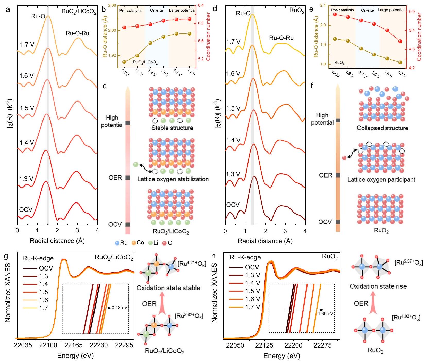 جهد الدائرة المفتوحة (OCV) إلى 1.7 فولت (من 1.90 إلى Å. على النقيض من ذلك، تميل رابطةإلى أن تكون أكثر تساهمية خلال عملية إزالة الليثيوم، مما يؤدي إلى انزياح سلبي لقشرة تنسيق Co-O فيوتشكيل طبقة إعادة بناء سطحية (من 1.92 إلىÅ. تؤكد تحويلة الموجة لحافة Ru K وحافة Co K EXAFS أيضًا هذه النتيجة بشكل بديهي (الأشكال التكملية 52-54). وبالتالي، ينظم الاستخراج الديناميكي لأيونات الليثيوم تساهمية رابطة Ru-O من خلال التفاعلات السطحية، مما يمكن أن يقيد مشاركة الأكسجين الشبكي ويحافظ على الاستقرار الهيكلي لـ(الشكل 5c). من الجدير بالذكر أن رابطة Ru-O فيتخضع لتقصير كبير منÅÅ. علاوة على ذلك، تشير التغيرات الطفيفة في عدد تنسيق Ru-O فيإلى استقرار الهيكل التنسيقي لـ. بالمقارنة، يمكن ملاحظة عدد تنسيق مخفض لرابطةفيوهو ما يُعزى إلى وجود أكسجين معيب (الشكل 5f). بسبب التساهمية القوية لرابطة Ru-O، يتبعمسار LOM وينتج عددًا كبيرًا من العيوب الأكسجينية خلال عملية OER، مما يؤدي إلى انهيار هيكل سطح المحفز.لتوضيح التغيرات في الهيكل الإلكتروني للمحفز الكهروكيميائي عند الجهود العالية، يتم الكشف عن حالات الأكسدة لـ