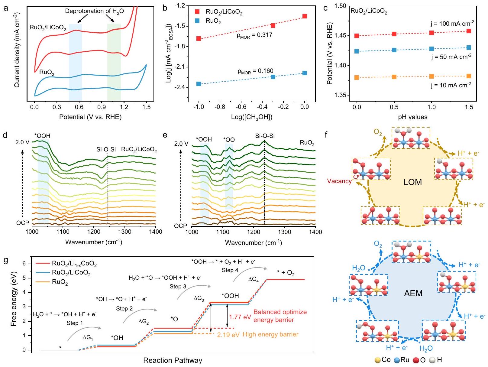 تفاعل أكسدة الميثانول (MOR) أكثر نشاطًا على-سطوح المحفزات المهيمنة بسبب آلية الهجوم النووي على المواقع الكهربية.تظهر تغطية سطحية عالية لـمقارنة بـفي الشكل 6b، مما يعني أنتحتوي على المزيد من مواقع OER النشطة الفعالة. علاوة على ذلك، فإن التغير في النشاط التحفيزي للمحفزعند قيم pH مختلفة ضئيل، وهو سمة من سمات آلية AEM النموذجية (الشكل 6c والشكل التكميلي 64). على النقيض من ذلك، تظهرسلوكًا يعتمد على pH لنشاط OER، مما يدل على حدوث آلية LOM غير مستقرة. تشير اختبار القطب الدوار والقرص وتحليل حاجز الطاقة للامتصاص/الإزالة للوسائط المحتوية على الليثيوم إلى أنه من الصعب على أيونات الليثيوم المستخرجة المشاركة في عملية OER لـ(الأشكال التكملية 65-68). علاوة على ذلك، تحافظعلى نفس الجهد في المحاليل الكهربائية ذات تركيزات أيونات الليثيوم المختلفة بعد 50 ساعة من اختبار الاستقرار، مما يؤكد أكثر أن الكمية الصغيرة من الليثيوم المستخرج لها تأثير ضئيل على أداء المحفز (الشكل التكميلي 69).