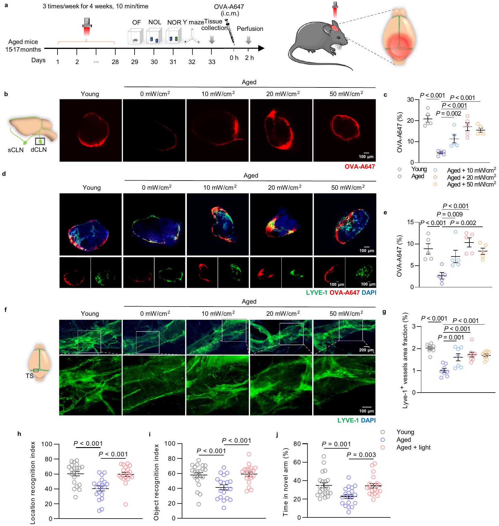 Fig. 1 | Effects of light on cognition and mLVs drainage in aged mice. a Schedule of treatments and behavior tests of aged mice. Representative images of deep cervical lymph nodes (dCLNs) accumulated with OVA-A647 at 2 h after injection (i.c.m.) (from 2 replicates). Scale bar . c Quantification of fluorescence distribution of OVA-A647 in dCLNs. mice in each group. d Representative section images of OVA-A647-accumulated dCLNs stained with LYVE-1 and DAPI (from 2 replicates). Scale bar . e Quantification of fluorescence distribution of OVA-A647 in dCLN sections. mice in each group. Representative images of meninges stained with LYVE-1 and DAPI (from 2 replicates).