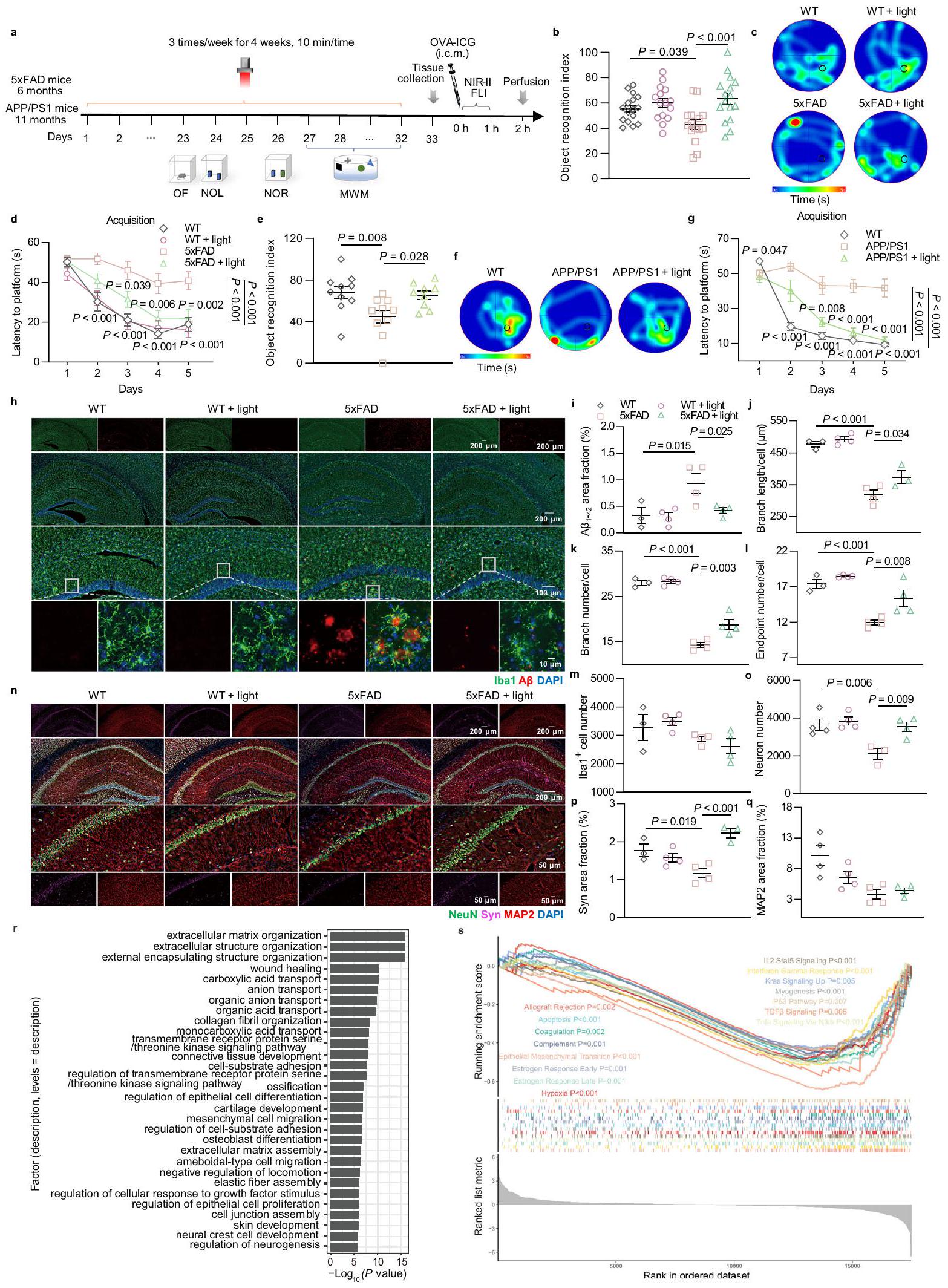 Fig. 2 | Ameliorating effects of light on cognition and pathology in AD mice. a Schedule of treatments and behavior tests of AD mice. b-d Object recognition index of NOR test (b), and representative occupancy heatmaps (c) and latency to platform (d) of MWM test of FAD mice. mice in WT and light groups, mice in WT + light and 5xFAD groups. e-g Object recognition index of NOR test (e), representative occupancy heatmaps (f) and latency to platform (g) of MWM test of APP/PS1 mice. mice in WT and APP/PS1 groups, mice in APP/PS1 + light group in data mice in each group in data . h Representative images of brain sections in hippocampus (HPC) stained with , Iba1 and DAPI. Scale bar or . i Quantification of area fraction of in HPC. Quantification of branch length per cell ( ), branch number per cell ( ), endpoint number ( ) and cell number ( ) of cells in HPC. mice in WT group, mice in other groups. Representative images of brain sections in HPC stained with NeuN, synaptophysin, MAP2 and DAPI. Scale bar or Quantification of neuron number ( ), and area fraction of Syn (p) and MAP2 (q) in HPC. r GO terms upon light treatment in 5xFAD mice. mice in each group. s Enrichment plots of GSEA. mice in each group. Data in are presented as mean SEM, and analyzed by one-way ANOVA (e) or two-way ANOVA (b, d, g, i-m, o-q) with Sidak’s multiple comparison test for comparisons of multiple groups. values in and were calculated with clusterProfiler using the hypergeometric test and empirical phenotype-based permutation test, respectively, without any adjustments for multiple comparisons. The statistical tests involved two-sided analysis. Source data are provided as a Source data file.