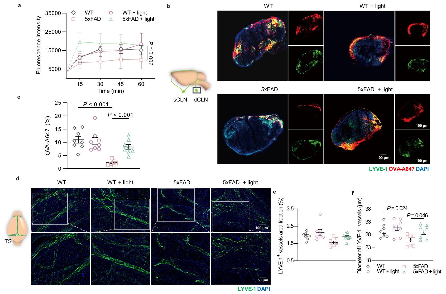 Fig. 3 | Improvement effects of light on drainage function and structural changes of mLVs in 5xFAD mice. a Quantification of fluorescence intensity of OVA-ICG in sCLNs after injection (i.c.m.). mice in each group. Representative section images of OVA-A647-accumulated dCLNs stained with LYVE-1 and DAPI (from 2 replicates). Scale bar Quantification of fluorescence distribution of OVA-A647 in dCLN sections. mice in each group. Representative