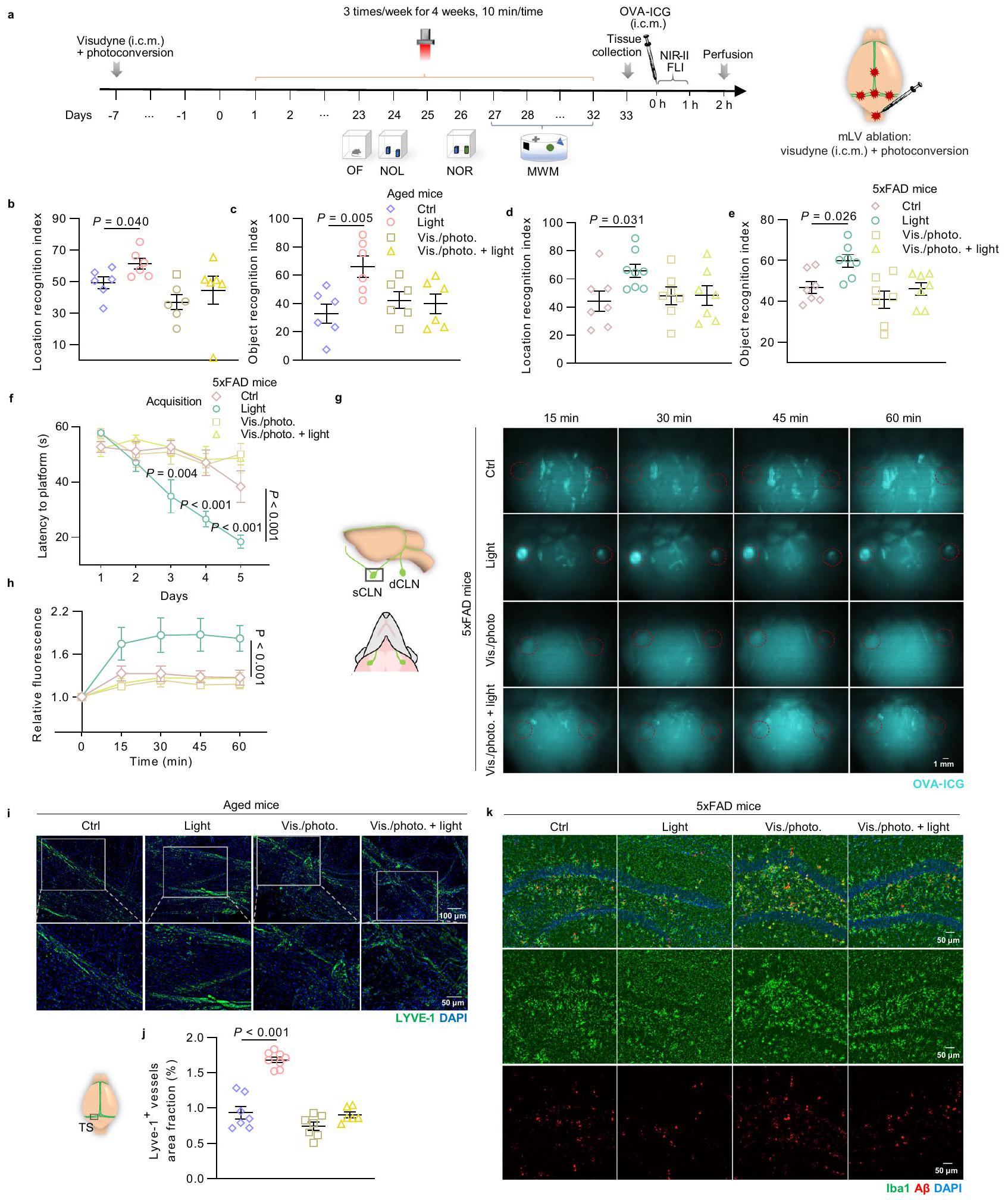 لتحديد ما إذا كان التأثير المفيد للضوء على الوظيفة الإدراكية ومرض الزهايمر المرتبط بالمرض يعتمد على زيادة تصريف الأوعية اللمفية الصغيرة، قمنا بإجراء استئصال للأوعية اللمفية الصغيرة على الفئران المسنّة (15-17 شهرًا، ذكور وإناث) وفئران 5xFAD (6 أشهر، ذكور) وفقًا للإجراء الموصوف في الدراسات السابقة.. ثم قمنا بإجراء علاج بالضوء ( ) على الفئران المسنّة التي تم استئصال mLVs و تمت معالجة الفئران FAD لمدة 4 أسابيع، ثم تم تقييم القدرة الحركية، والقلق، والتعلم والذاكرة لدى الفئران من خلال اختبارات سلوكية (الشكل 4a). لم يكن للضوء أي تأثير على المسافة الإجمالية، أو السرعة المتوسطة، أو الوقت في المركز في اختبار OF (الشكل التكميلي 9a-d والشكل التكميلي 10a-d)، مما يشير إلى عدم وجود تغيير في الحركة أو سلوك القلق. مشابهًا للنتائج المذكورة أعلاه، حسّن علاج الضوء وظيفة التعلم والذاكرة لدى الفئران المسنّة وفئران AD، بينما لم تكن هناك تأثيرات في الفئران التي تم استئصال mLVs منها (مؤشر التعرف على الكائن: Vis./photo. +light للفئران المسنّة:مقابل الصور/الفوتوغرافية للفئران المسنّة:، في اختبار NOR؛ رؤية/صورة + ضوء من فئران 5xFAD: مقابل صورة/فوتوغرافية لـ فئران، في اختبار NOR) (الشكل 4ب-و، الشكل التوضيحي 9هـ-ك والشكل التوضيحي 10هـ-ن). أظهرت هذه النتائج التأثير الإيجابي لعلاج الضوء في تحسين الإدراك لدى الفئران المسنّة وفئران الزهايمر، والذي تم إلغاؤه بعد إزالة الممرات اللمفية المتوسطة، مما يكشف أن الممرات اللمفية المتوسطة لعبت دورًا مهمًا في تعزيز الإدراك من خلال علاج الضوء.