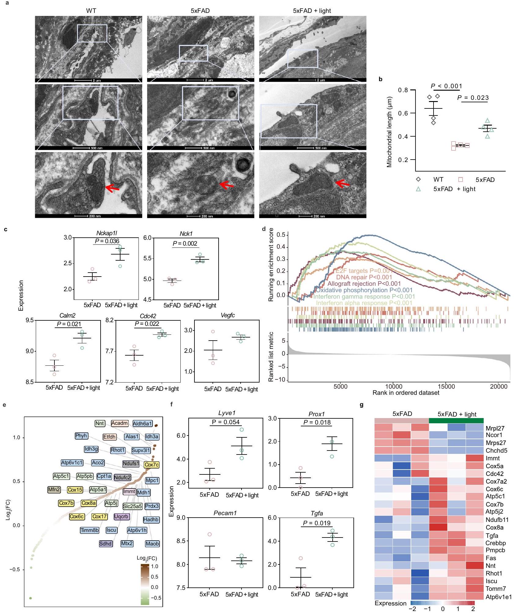 Fig. 5 | Improvement effects of light on microstructure and gene expression of mLVs in 5xFAD mice. a Representative transmission electron microscopy (TEM) images of mLEC arrangement and mitochondrial morphology (red arrowheads: mitochondria of mLECs) (from 2 replicates). Scale bar or 200 nm . b Quantification of mitochondrial length of mLECs. mice in each group. c Expression of Nckap1l, Nck1, Calm2, Cdc42 and Vegfc in meninges between lighttreated AD group and AD group. d Enrichment plot of Hallmark gene sets by GSEA of meninges, showing the profile of the running enrichment score and positions of gene set members on the rank-ordered list. e Scatter plot of genes enriched in oxidative phosphorylation and ranked according to (FC: fold change).