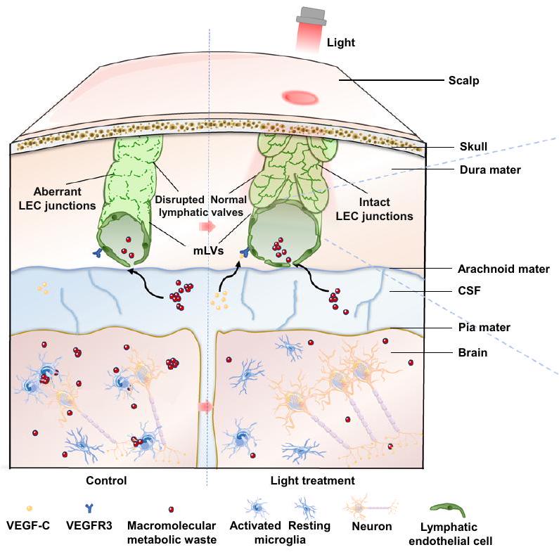 في دراستنا، أكدنا أن العلاج الضوئي المستهدف لـ mLVs عزز الإدراك في الفئران المسنّة وفئران الزهايمر. علاوة على ذلك، كشفنا أن الضوء يمكن أن يستعيد الأيض الميتوكوندري والوظيفة الخلوية لـ mLECs، مما يساهم في تحسين ترتيب الخلايا لـ mLVs لتحسين ديناميات التصريف لتخفيف الأمراض في فئران الزهايمر. بشكل عام، نقدم علاجًا محتملاً للأمراض العصبية من خلال تعديل نقل mLVs لتنظيف النفايات في الجهاز العصبي المركزي، مما قد يخفف من ضعف الإدراك والأمراض المرتبطة.