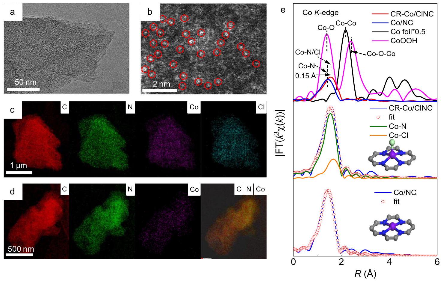 تظهر صور المجهر الإلكتروني الناقل (TEM) أن المحفزات CR-Co/CINC و Co/NC المكتسبة تمتلك هيكلًا شبيهًا بالورقة (الشكل 1a والأشكال التكميلية 1 و 2) دون وجود جزيئات نانوية واضحة. يؤكد المجهر الإلكتروني الناقل ذو الزاوية العالية (HAADF-STEM، الشكل 1b) لـ CR-Co/CINC وجود نقاط ساطعة كثيفة ومعزولة محددة بدوائر حمراء، مما يدل على وجود ذرات الكوبالت الموزعة ذريًا والمثبتة على ركيزة NC. يمكن إثبات ذلك بشكل أكبر من خلال نتائج حيود الأشعة السينية (XRD) في الشكل التكميلية 3، التي تظهر غياب قمم الحيود المرتبطة بأنواع الكوبالت. لتوضيح الهيكل الشكلي لمواقع الكوبالت بشكل أكبر، تكشف صور رسم الخرائط العنصرية عن التوزيع المتجانس لـ، و Cl في الكل معمارية CINC (الشكل 1c) وتوزيع متجانس للكربون والنيتروجين والكوبالت فيعينة (الشكل 1د). الـتظهر منحنيات الامتصاص الفيزيائي مساحة سطح محددة أكبر قليلاً لـ CR-Co/CINC وهندسة مسامية مشابهة بالمقارنة مع (الشكل التوضيحي 4). من المهم أن تحميلات الكوبالت لـ CR-Co/CINC و Co/NC كانت و على التوالي، كما تم تحديده من تحليل طيف الانبعاث الضوئي الناتج عن البلازما المقترنة بالحث (ICP-OES). تؤكد هذه النتائج التشتت المتجانس لذرات الكوبالت على مواقع السطح لمادة NC وإدخال الكلور في.