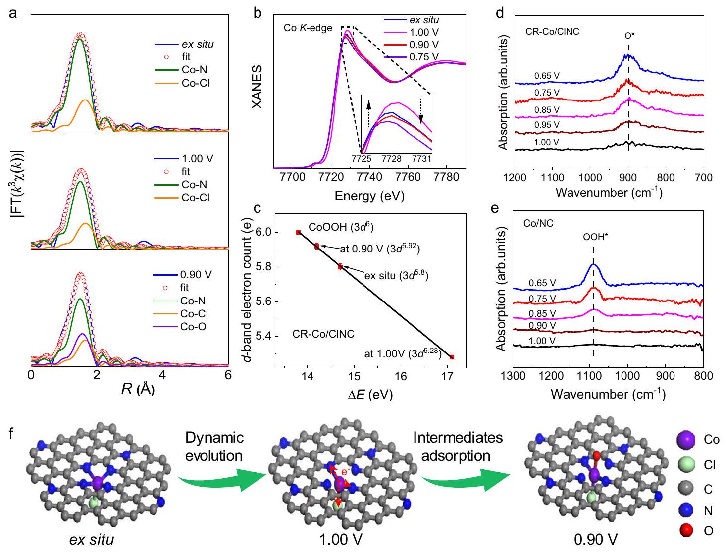 Above all, the dynamic evolution of active sites under working conditions is schematically shown in Fig. 4f. Firstly, the Co centers are dynamically released from the substrate to form a coordinationreduced active structure at the early reaction state (at 1.0 V conditions), revealing a lower -band electron filling. Remarkably, these coordination-reduced moieties obviously optimize the adsorption of oxygen-containing intermediates in situ and promote the cleavage of the bond for fast reaction kinetics. Finally, the *O active structure is retained as the potential steadily decreases to 0.75 V , thereby realizing a highly efficient ORR process. Moreover, the dynamically evolved electron and coordination structures of the Co sites return to their original state after the reaction according to the XAFS results (Supplementary Fig. 33), suggesting that the structural evolution of the Co active site is a dynamic reversible process. These results suggest that the in situ modulated -band electron filling of Co sites through the introduction of Cl can yield