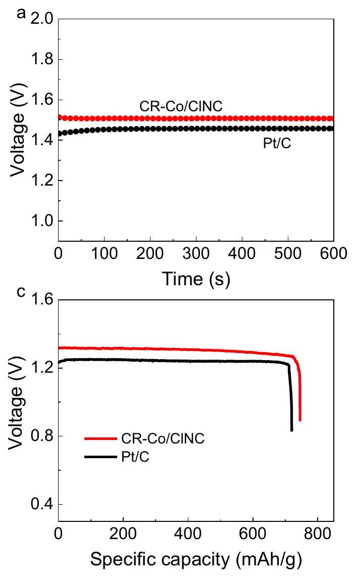 Fig. 5 | Zn-air battery (ZAB) performance. a Open-circuit voltage plots of Zn-air batteries assembled with CR-Co/CINC and Pt/C. b Discharge polarization curves and power density plots of CR-Co/ClNC and Pt/C-based Zn-air batteries. c Specific