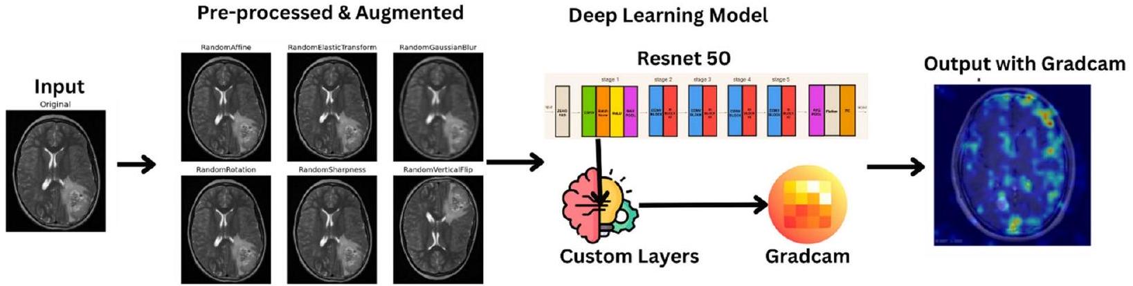 intricate details necessary for accurate tumor detection. Grad-CAM is then applied to the trained model, providing visual explanations that highlight the regions in the MRI images most influential to the model’s predictions, thus offering a transparent view into the model’s operational mechanics.