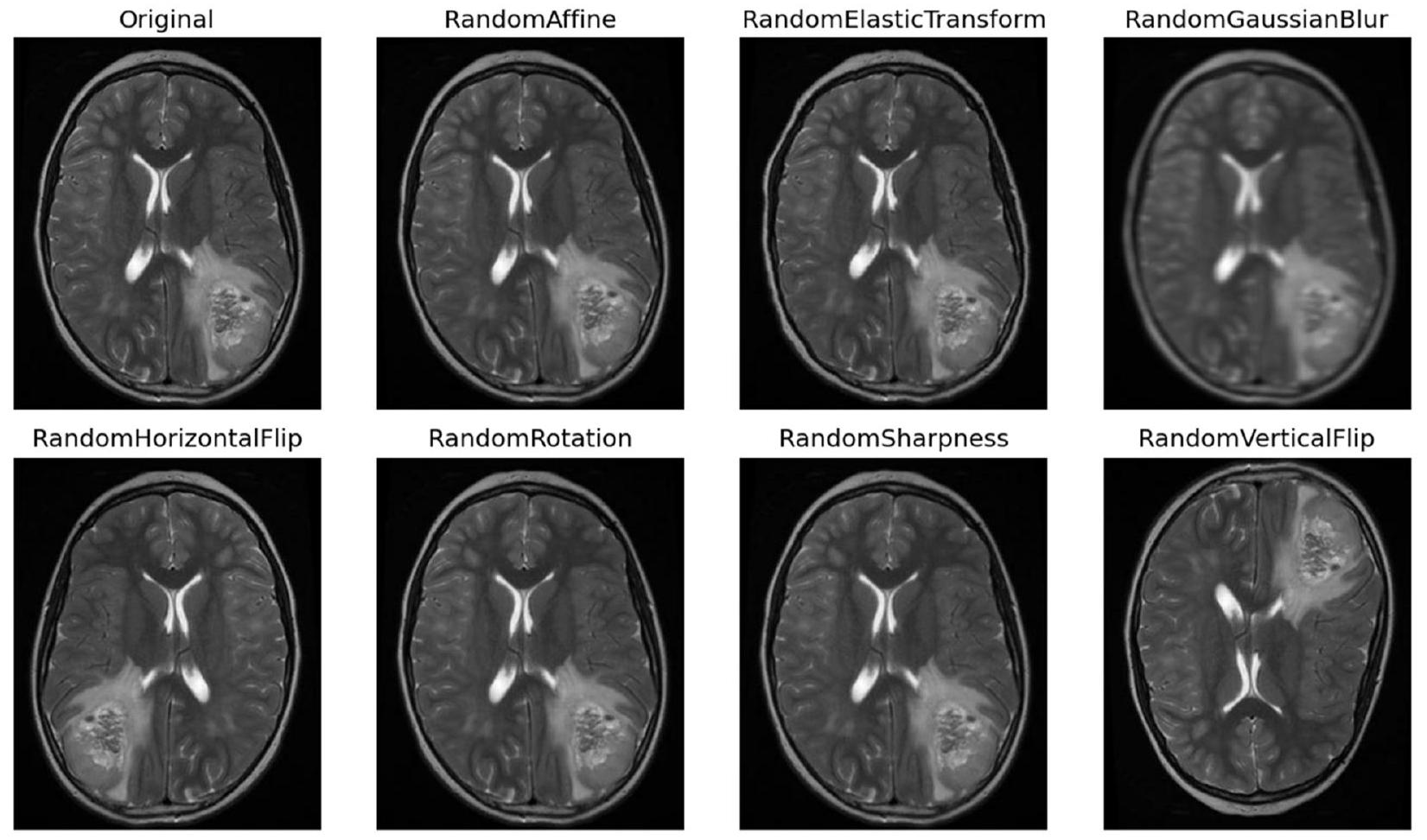 تُصبح التقنيات ضرورية لتعزيز ثراء مجموعة البيانات، مما يزيد من قوة النموذج وقدراته على التعميم. تشمل منهجيات التAugmentation مجموعة من العمليات التحويلية، كل منها مصمم لإدخال تنوعات مختلفة تعكس سيناريوهات الأورام في العالم الحقيقي. تُعتبر التدوير تقنية أساسية، حيث تسهل إنشاء صور من زوايا متعددة لمحاكاة المنظورات المتنوعة التي يتم مواجهتها في التصوير السريري [20]. في الشكل 5، تُظهر بعض الصور المعززة.
