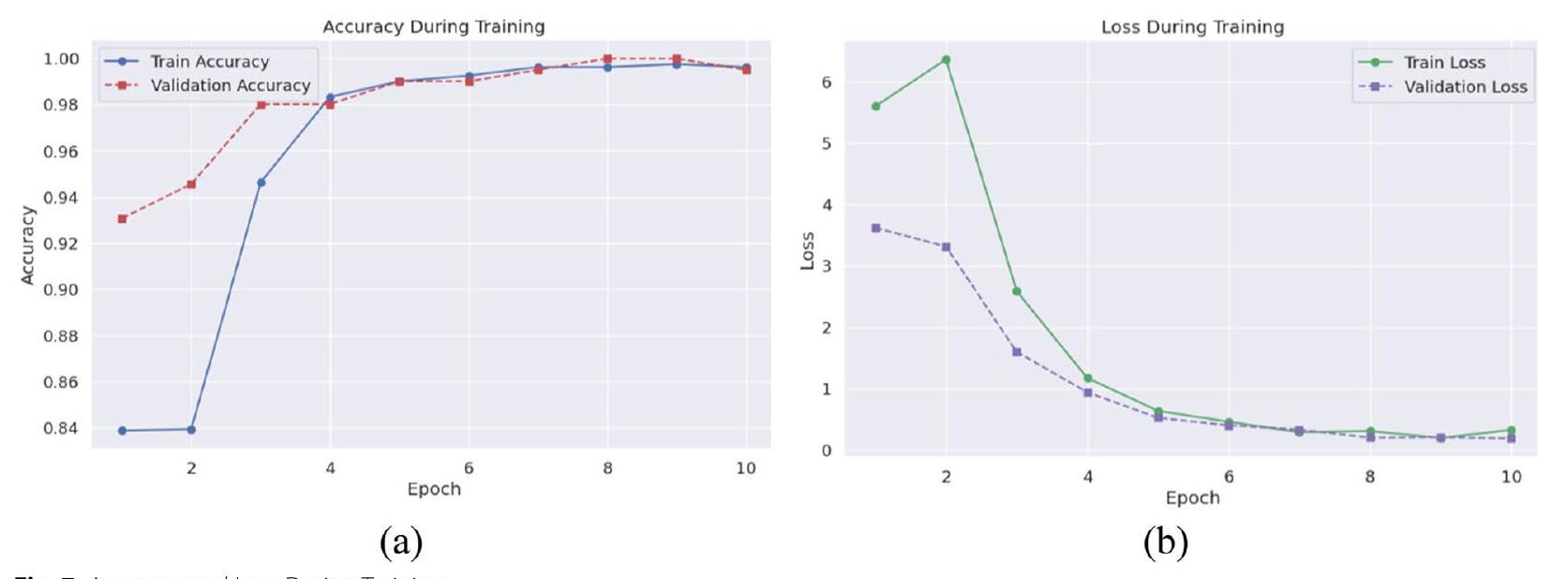 بدقة. عززت مقاييس الدقة والاسترجاع ودرجة F1 موثوقية النموذج، حيث اقتربت القيم من 100% بحلول العصر الثامن، مما يدل على أداء قوي في تحديد الحالات الإيجابية الحقيقية مع تقليل الإيجابيات والسلبية الكاذبة. على مجموعة الاختبار، أظهر النموذج دقة مثيرة للإعجاب قدرها