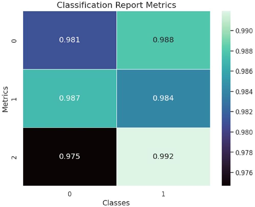 categories accurately. Precision, recall, and F1-score metrics further underscored the model’s reliability, with values nearing 100% by the eighth epoch, indicative of robust performance in identifying true positive cases while minimizing false positives and negatives. On the test set, the model exhibited an impressive accuracy of