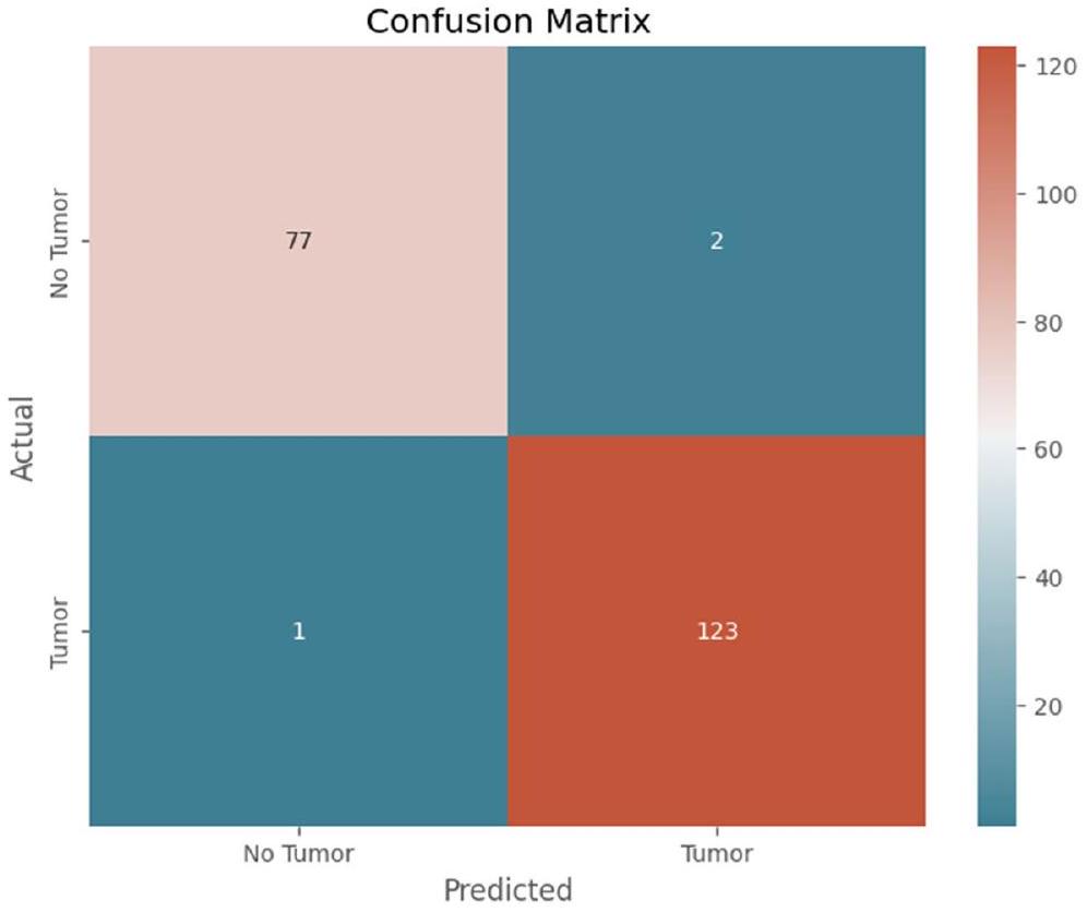 During the validation and testing phases, the model’s performance and generalization ability were meticulously scrutinized, yielding comprehensive insights into its efficacy in brain tumor detection. Validation accuracy emerged as a pivotal metric, with the model achieving a remarkable peak accuracy of