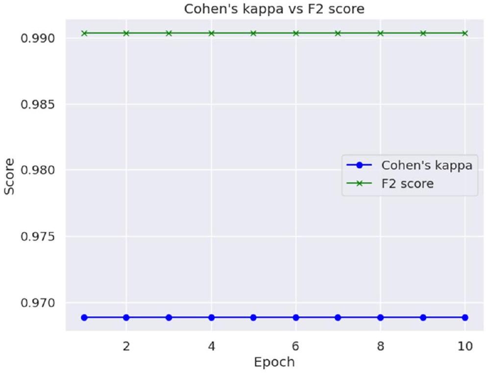 Cohen’s Kappa and F2 Score has been depicted epoch wise in Fig. 11.
