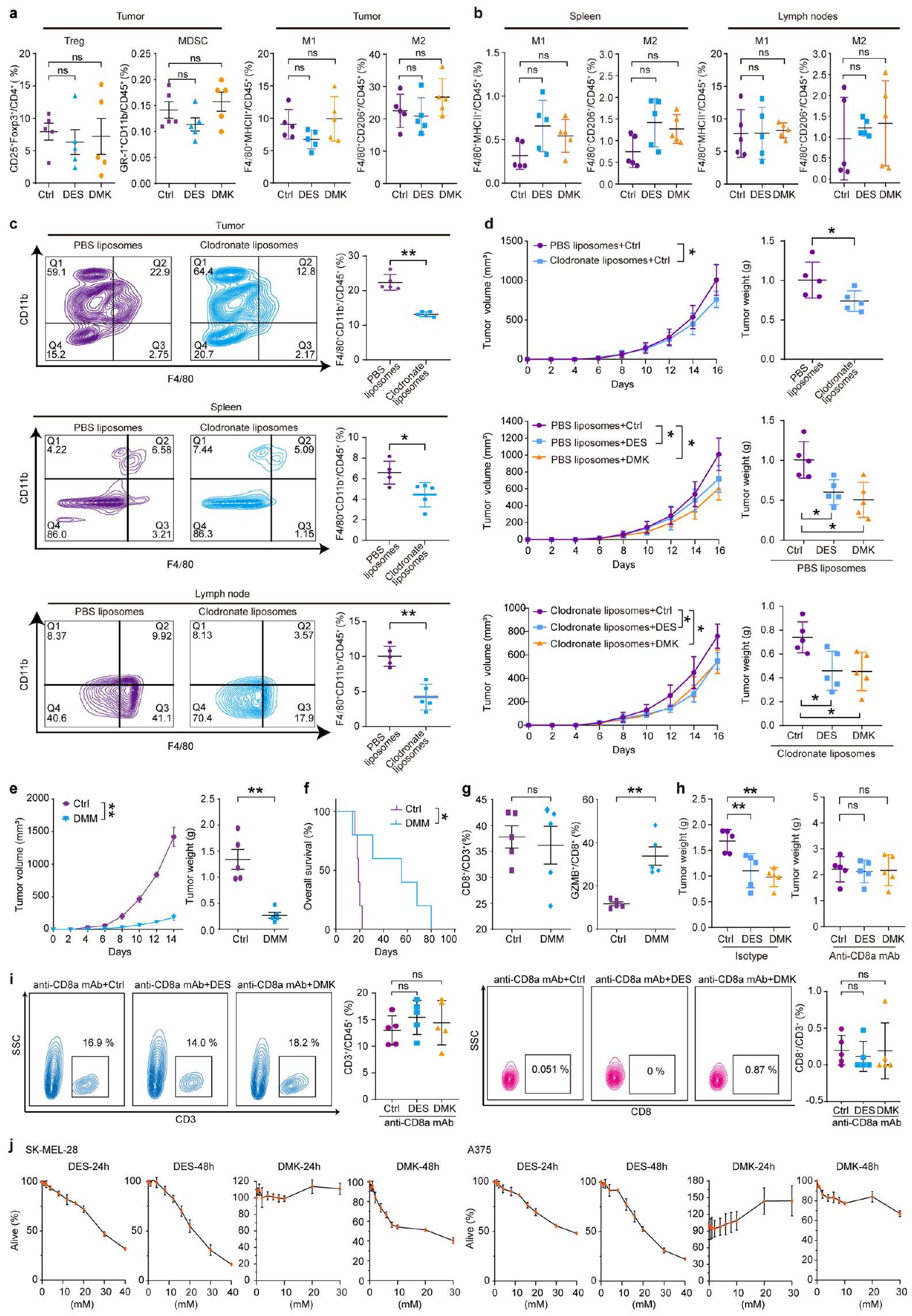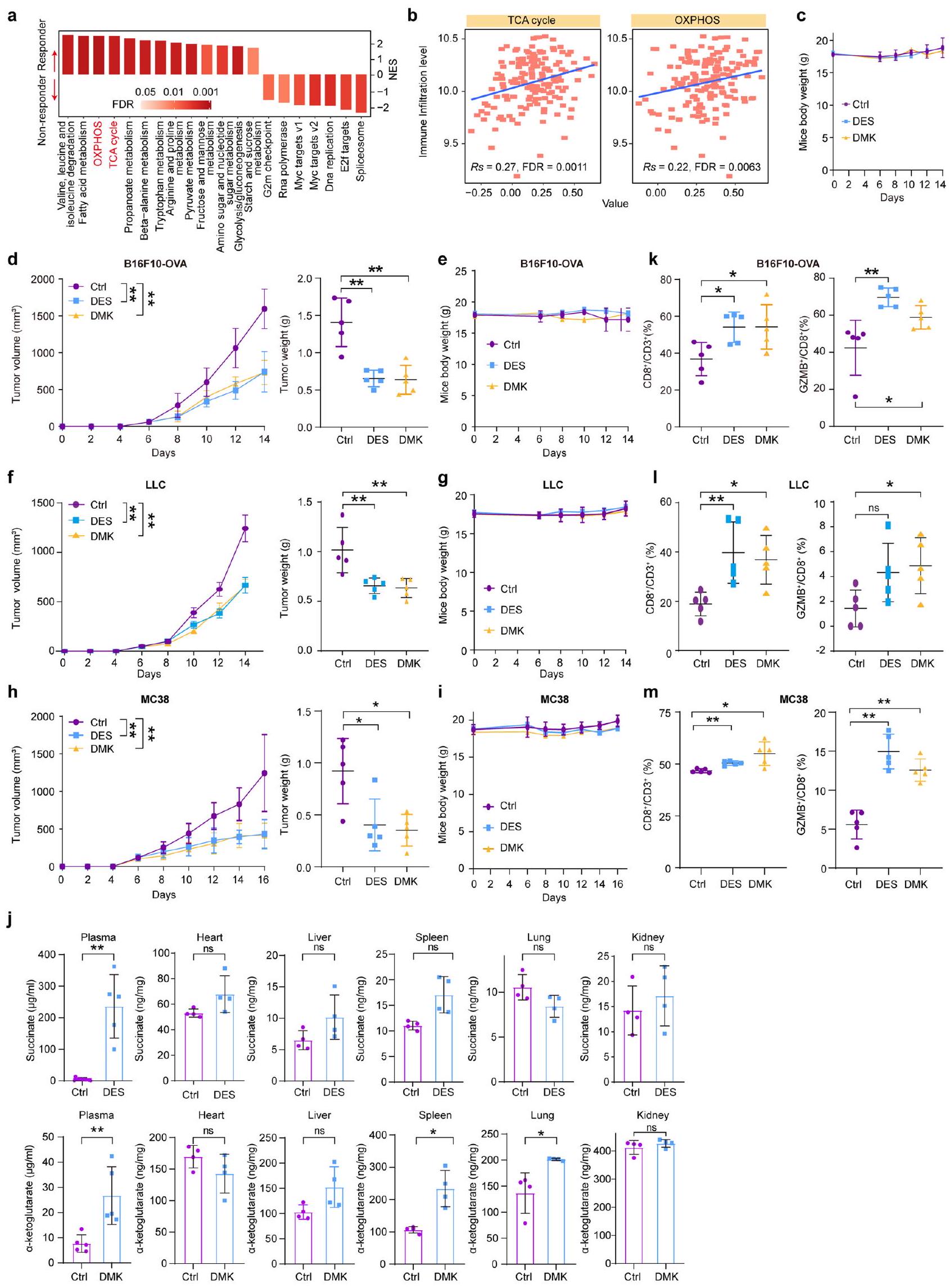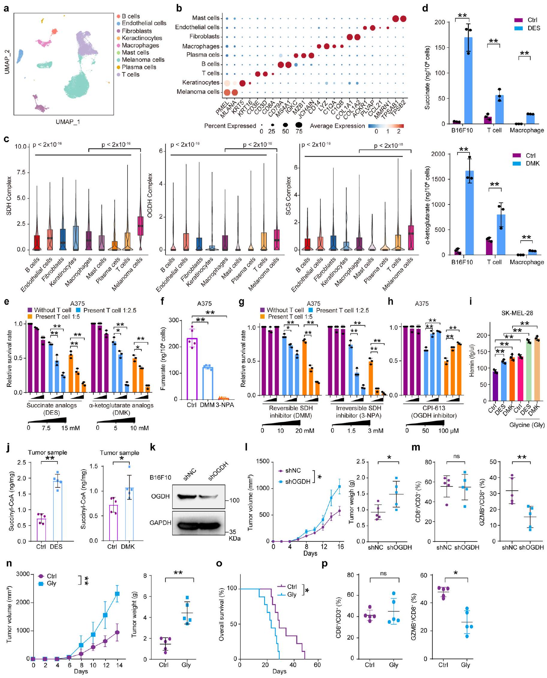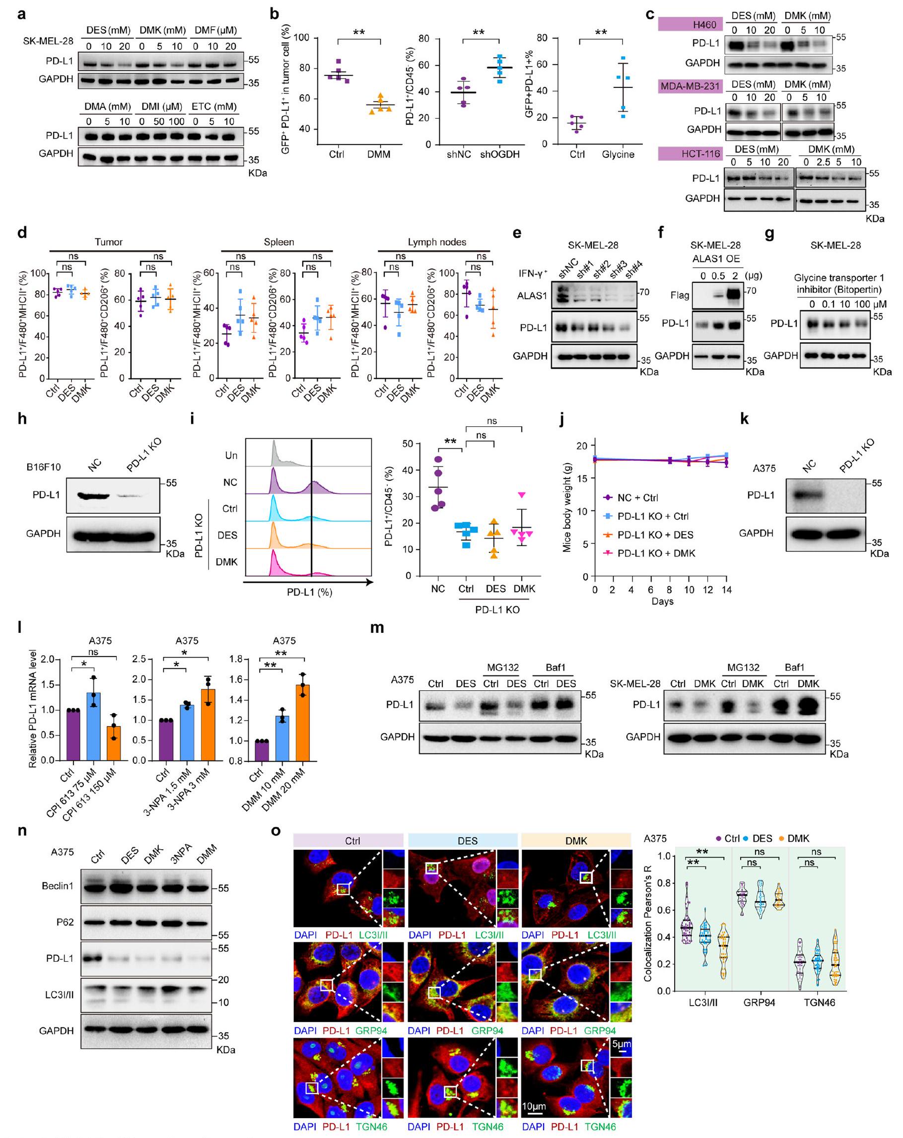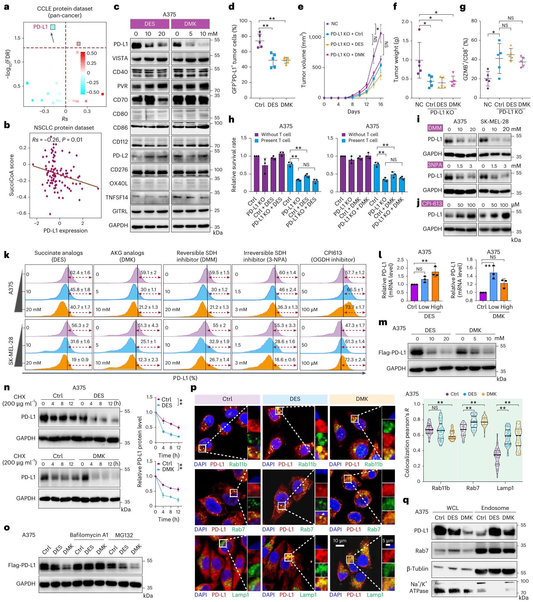 per group).g, Survival analysis of mice after treatment with DMK or DES , Succinate and AKG levels in tumor cells from DMK- or DES-treated mice ( per group). i, Quantification of and CTL percentages in tumor masses ( per group). , Immunostaining of CD3, CD8, and GZMB in B16F10 tumors ( per group). Scale bar, . k, Tumor volume measurements after CD8 T cell depletion and treatments ( per group). I, Spatial transcriptomic heatmap of OGDH, SCS and SDH expression in tumor regions. Scale bar, , Schematic of succinyl-CoA production pathways. n, Succinate and AKG levels in A375 cells treated with metabolite analogs ., O, A375 cells treated with glycine and metabolite analogs, cocultured with T cells, followed by Crystal Violet staining ( ). , Succinyl-CoA levels measured by LC-MS in A375 cells ( ). For details on visualization, statistics and reproducibility, see Methods. Note, in a-n, n represents biologically independent samples and, in and , independent experiments. - PD-L1 levels after treatment with DES, DMK, DMM, 3-NPA and CPI-613 for 24 h (
