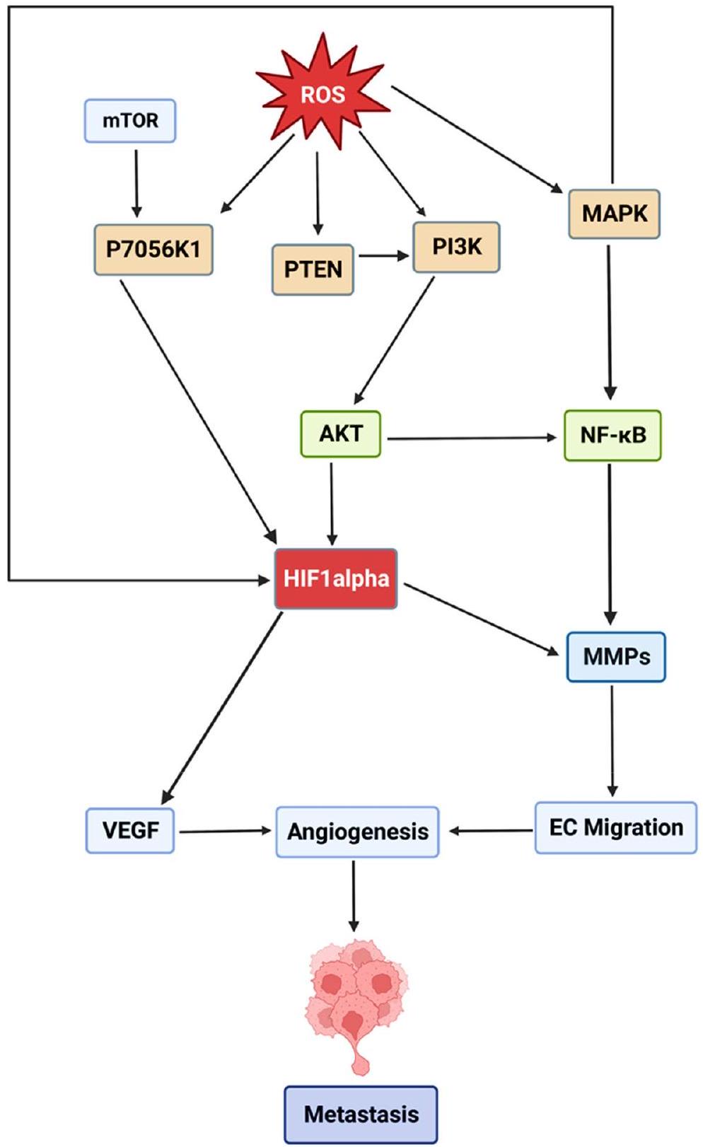 الإجهاد التأكسدي يتفاعل مع الجزيئات الكبيرة الخلوية مثل الحمض النووي DNA، والحمض النووي الريبوزي RNA، والبروتينات. على وجه التحديد، يمكن لأنواع الأكسجين التفاعلية (ROS) أن تسبب طفرات في الحمض النووي، وكسور في السلاسل، وحتى شذوذات كروموسومية من خلال التفاعل مع القواعد النيتروجينية والعمود الفقري من السكر والفوسفات. تؤدي هذه التغيرات الجينية إلى اضطراب التنظيم الطبيعي لدورة الخلية، والبرمجة الخلوية للموت (الاستماتة)، وآليات إصلاح الحمض النووي. يؤدي تدهور سلامة الجينوم إلى تنشيط الجينات المسرطنة وإلغاء تنشيط جينات كابحة للأورام، مما يهيئ بيئة ملائمة لتكاثر الخلايا غير المنضبط وتكوين الأورام [7-10]. لوحظ في دراسات متعددة أن الإجهاد التأكسدي يشارك في بدء وتقدم أنواع مختلفة من السرطانات، بما في ذلك الميلانوما، واللوكيميا، واللمفوما، وسرطان الفم، والبنكرياس، والمبيض، والمثانة، والثدي، وعنق الرحم، والدماغ، والمعدة، والكبد، والرئة، والبروستاتا [11-14]. تُنتج أنواع الأكسجين التفاعلية (ROS) بشكل كبير في الميتوكوندريا داخل الخلايا (الشكل 1) [14]، وتُعتبر المساهم الرئيسي المحتمل في الإجهاد التأكسدي والسرطان [15]. تُعد ROS جزيئات إشارة داخل الخلوية تساهم بشكل كبير في مسارات الإشارة المختلفة، بما في ذلك مسار إشارة عامل النمو الشبيه بالأنسولين، ومسار إشارة الكاتيونات الذي يتوسطه قناة المستقبلات العابرة للتيار [16]. في مسار إشارة عامل النمو، ROS، بشكل رئيسي…