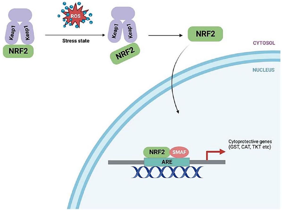 | NRF2 | Initiates cytoprotective mechanisms by binding with sMAF proteins and ARE in the nucleus | Activates expression of cytoprotective genes | Colorectal, Breast, Liver, Gall Bladder, Prostate, Gastric, Ovarian, and Lung | [57] [7] [58] [60]; ;,[59]; |