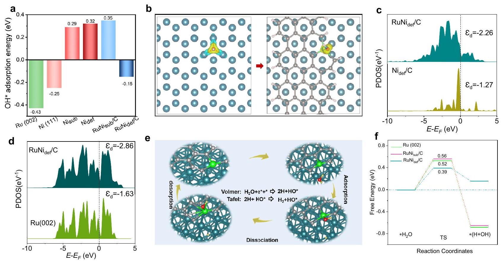 work (Supplementary Fig. 3b), occupying the defective carbon sites, whereas there is no bonding between Ru and Ni. The elaborate electronic structure examine is firstly reflected in the OH differential charge density, for investigating the charge supply capacity of different structural models to OH group. Figure 1 b and Supplementary Fig. 10 show that the OH -related charge redistribution of active Ru in the model with introduction of Ni single atom anchored defect carbon, in which defective carbon serves as a carbon bridge (electron library) to establish OH charge connections between Ni and Ru sites, resulting in the synergistic adsorption of OH intermediates between the two sites. Therefore, the model, with its reduced accumulation of charge on Ru by the modulation of , ensures a weaker adsorption of OH than pure Ru (002) does. In addition, the partial density of states (PDOS) was used to examine the electronic interactions between the Ru and Ni sites and thus to analyze the causes of the OH adsorption energy changes. As shown in Fig. 1c, the introduction of into Ru caused a downward shift of the d-band center to and therefore caused the weakening of OH adsorption on the Ni site. While as the enters the pure Ru system, the d-band center shifts downward from -1.63 eV to -2.86 eV (Fig. 1d) due to the rearrangement of electrons around Ru, and the adsorption of Ru on OH is weakened. Notably, the electronic interactions between Ru and Ni weaken the adsorption of OH by , thus reducing the final water decomposition energy barrier.