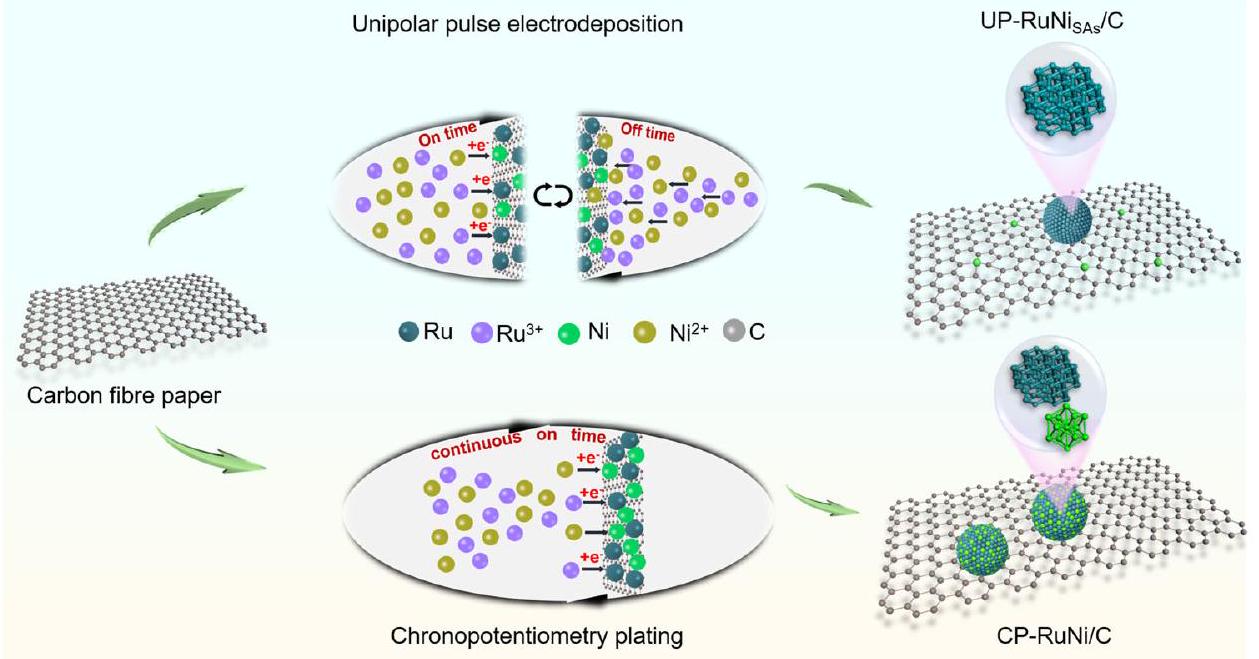 Fig. 2 | Illustration of the synthesis procedure of UP-RuNi and CP-RuNi/C catalysts. (I) UP-RuNi catalyst obtained by controlling intermittent current on-off states via a UPED strategy; (II) CP-RuNi/C catalyst obtain controlling current continuous conduction through a potentiostatic strategy.