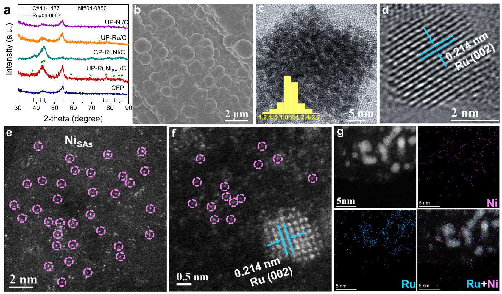 The X-ray diffraction (XRD) patterns of the UP-RuNi and CPRuNi/C (Fig. 3a and Supplementary Figs. 20-21) show the diffraction peaks corresponding to the Ru (PDF no. 06-0633), with the tiny particle size of Ru particles for UP-RuNi evident from the broad peaks. Particularly, the slow scanning XRD pattern of UP-RuNi shows diffraction peaks of Ru nanocrystals (PDF no. 06-0633) and there is no diffraction signal of Ni , which was initially thought to be a weak content of Ni or the presence of . As indicated in Fig. 3b and Supplementary Fig. 22a of the scanning electron microscopy (SEM) images, agglomerate-like particles of about in size were uniformly loaded on the carbon substrate, and further magnification (Supplementary Fig. 22b) showed that these particles of about in size are agglomerated from smaller nanoparticles to form a rough surface. The transmission electron microscopy (TEM) image and the corresponding size distribution plot (Fig. 3c) further demonstrated that the size of the nanocrystalline is about 2 nm . As shown in Fig. 3d, the UP-RuNi displayed lattice fringes of 0.214 nm , corresponding to the (002) crystal plane of hexagonal Ru. Nis and Ru nanocrystals can be accurately distinguished and identified using spherical aberration correction scanning TEM (AC-STEM). Figure 3e revealed the uniform dispersion of bright spots, indicating the uniform distribution of highcontrast single atoms on carbon fiber paper (CFP). Additionally, higher-resolution AC-TEM enables the observation of the scattered bright spots, while higher brightness Ru crystals can be seen due to the larger atomic number and the Ru (002) surface can be exposed (Fig. 3f). We can preliminarily speculate that the scattered bright spots around the Ru crystal are , which was further validated through STEM-EDS. From Fig. 3 g , it can be observed that Ru element is uniformly dispersed at the position of the nanocrystal, while Ni element is uniformly dispersed around the substrate and Ru. Inductively coupled plasma optical emission spectrometry (ICP-OES) accurately analyzed the Ru and Ni contents in the catalysts, revealing atomic ratios of for in UP-RuNi and in CP-RuNi/C respectively (Supplementary Fig. 23). The CP-RuNi/C catalyst exhibited