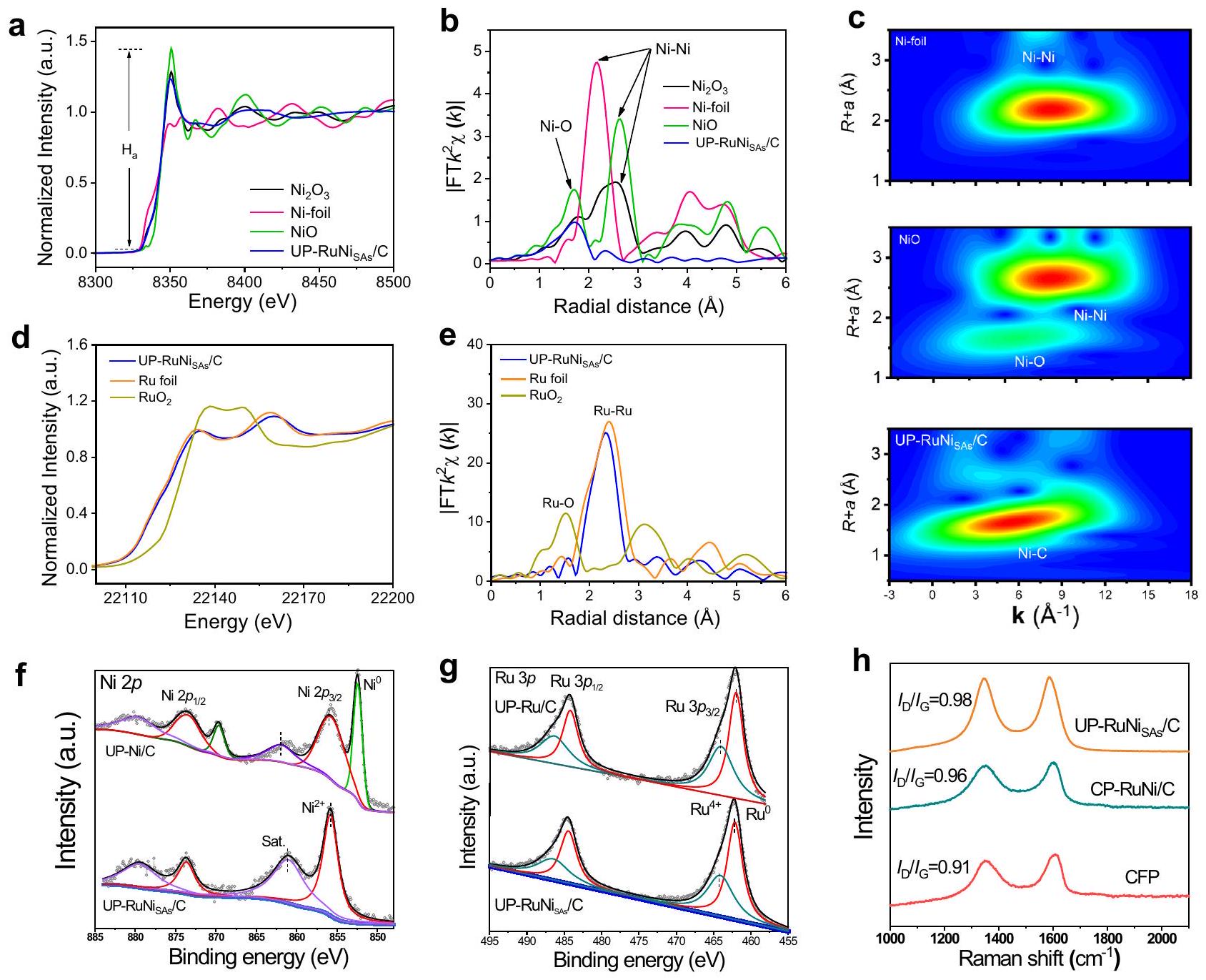 spectra of UP-RuNi , and Ru foil at Ru -edge. High-resolution XPS spectra analysis of for UP-Ni/C, UP-Ru/C, and UP-RuNi catalysts. g Highresolution XPS spectra analysis of Ru for UP-Ni/C, UP-Ru/C, and UP-RuNi catalysts. h Raman analysis of CFP, CP-RuNi/C, and UP-RuNi catalysts.